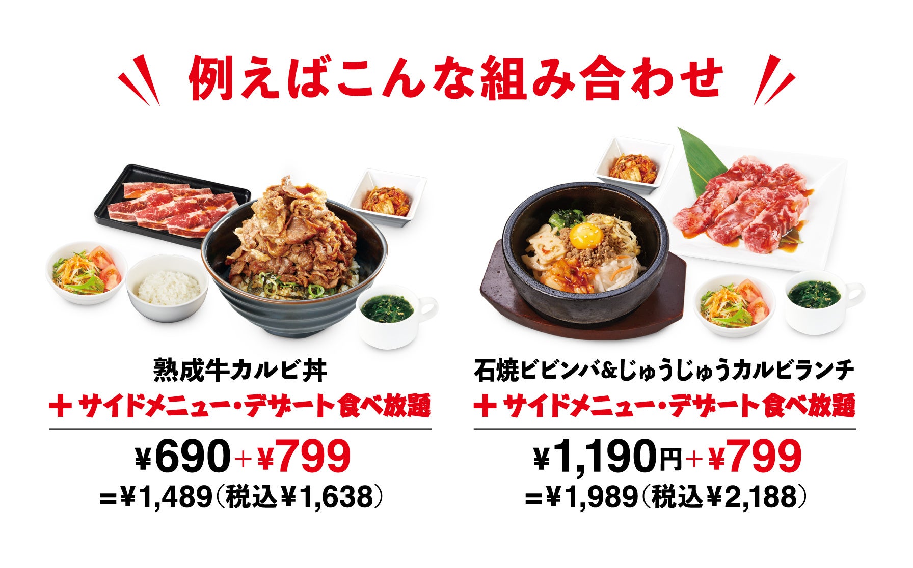 ・すべての焼肉定食にプラス799円(税込879円)でサイドメニュー・デザート食べ放題をご注文いただけます。