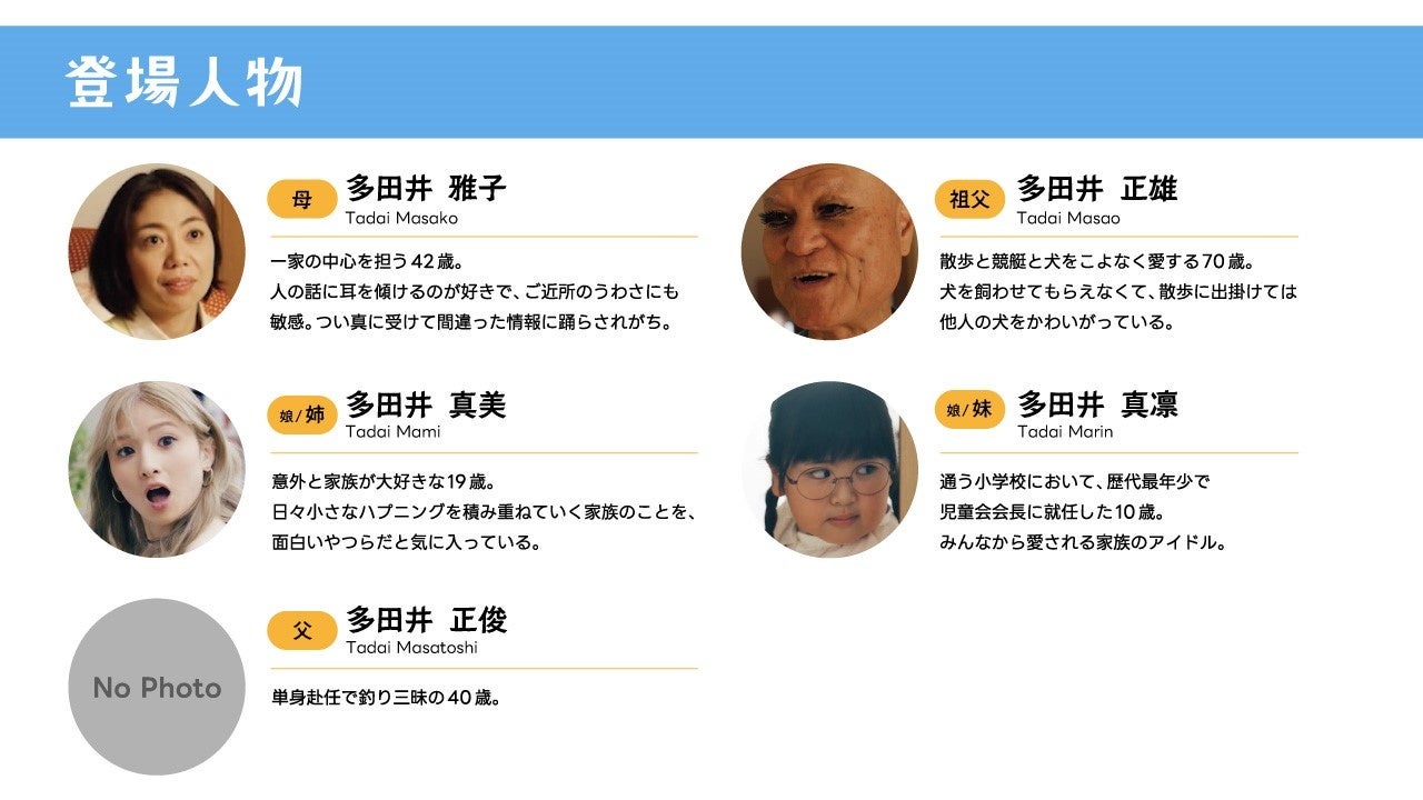 CMに登場する「多田井家」は、どこかで見たことがあるような親しみのある一家。家族それぞれの個性や異なる価値観の“ズレ”から、日々のちょっとしたすれ違いやハプニングが起こります。「流行に乗り遅れる」「うわさに踊らされる」「常識のズレに驚く」など、誰もが経験したことのあるような出来事を通じて、情報との向き合い方について、自然と考えるきっかけを生み出す内容になっています。