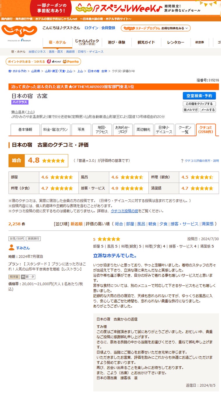 大手宿泊予約サイト「じゃらん.net」のクチコミ評価においても2施設共に高評価を獲得しており、これまでもずっとお客様のクチコミに対してすべて返信を行うなど、日々顧客満足度の向上へ改善に努めている。