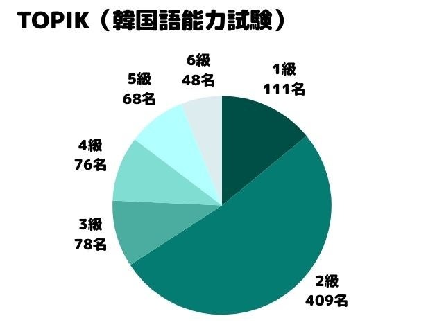 特にTOPIKにおいては2級合格者が最も多く、ハングル能力検定では4級・5級・3級の順に登録数が多くなっています。多くの方が、実用レベルの韓国語力を身につけていることがうかがえます。