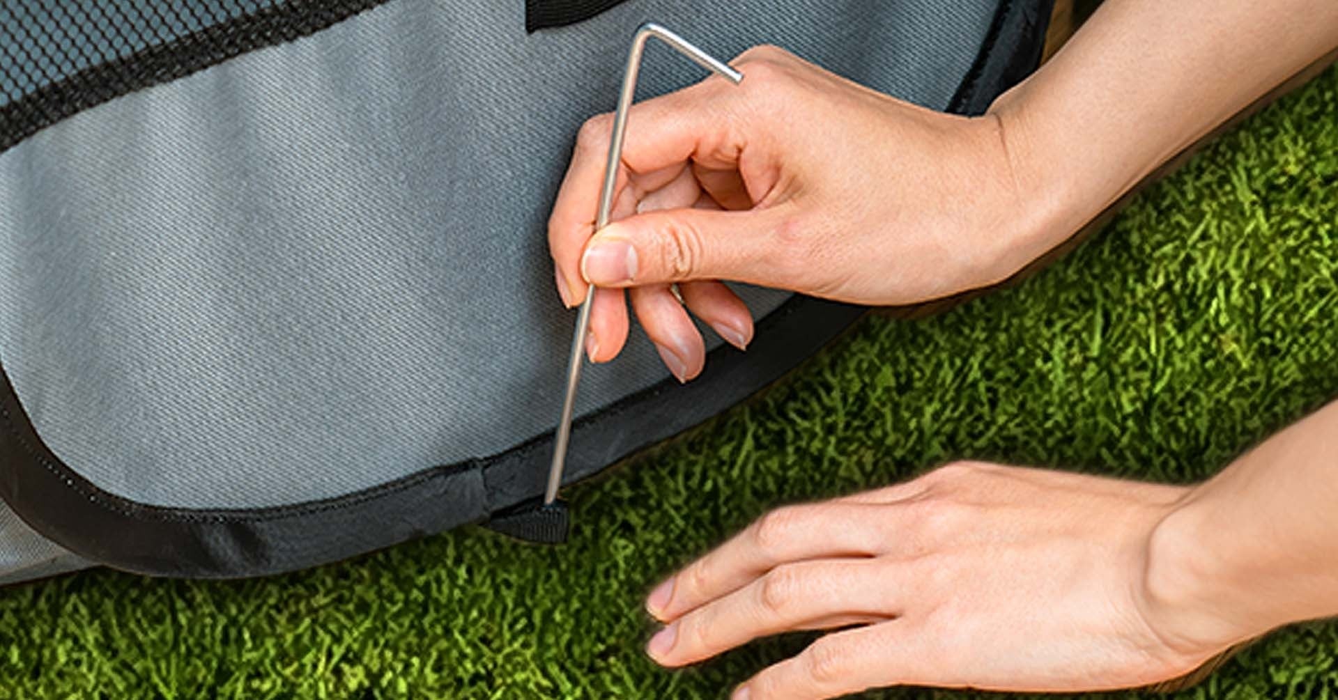 アウトドアや旅行などのお出かけ時にもノンストレスで使っていただけるよう、ペグ用ロープ付きで地面にしっかり固定できる仕様です。