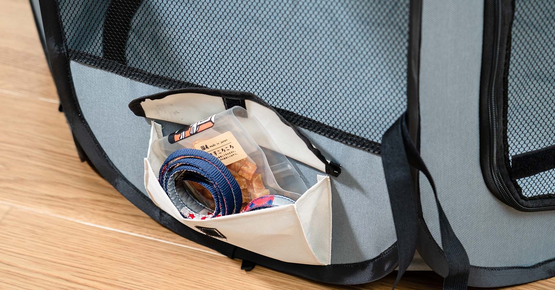 さらに側面には、オヤツやハーネスなどちょっとした小物を入れておくのに便利なポケットも付けました。