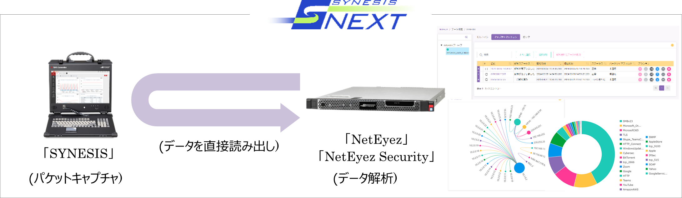 「SYNESIS Next」は、大容量パケットキャプチャ/解析システム「SYNESIS」に、ネットワーク監視機能を持つ「NetEyez」やセキュリティリスク可視化の機能を持つ「NetEyez Security」を連携させたソリューションです。企業ネットワークの膨大な通信データを取りこぼしなく捕捉し、さらにその分析結果を詳細に可視化することが可能です。これにより、安全かつ安定的な企業ネットワーク運用を効率的に支援いたします。