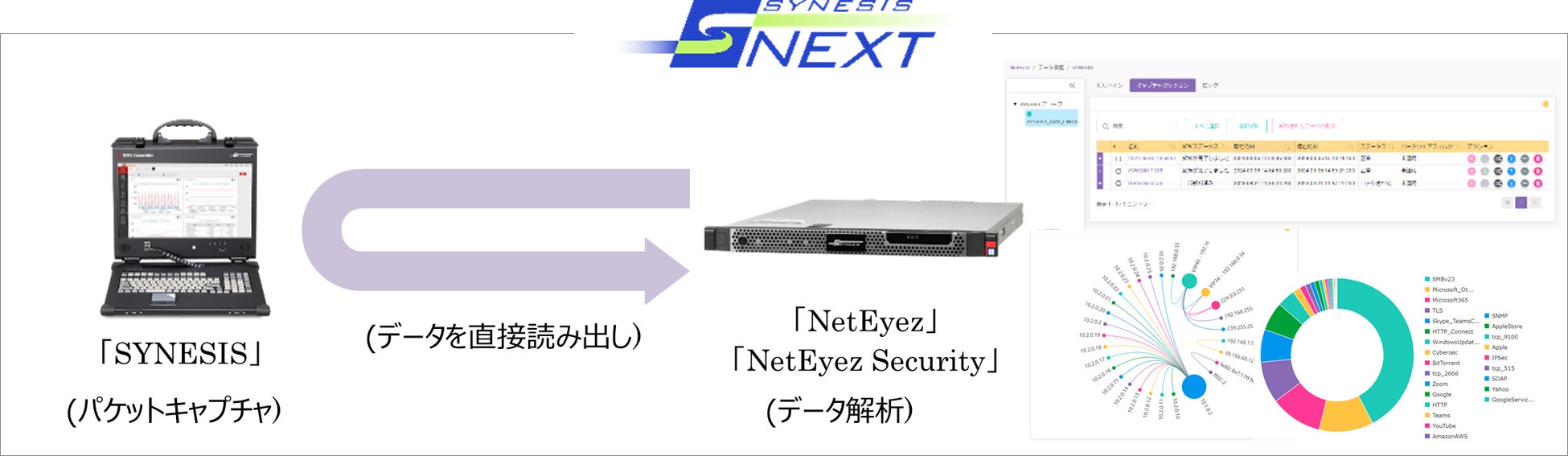 これに対し、東陽テクニカは、自社開発した「ネットワーク通信のパケットキャプチャ機能」と「ネットワーク監視・セキュリティリスク可視化の機能」を連携して一つにした新たなソリューション「SYNESIS Next」を発売いたします。大容量パケットキャプチャ/解析システム「SYNESIS」で東陽テクニカが持つ特許技術※を使い企業ネットワーク上を流れる大量のデータを確実に捕捉し、「NetEyez」のネットワーク監視機能と「NetEyez Security」のセキュリティリスク可視化機能を統合してネットワークの詳細な分析までを共通のGUIからシームレスかつ迅速に行うことが可能です。これにより、エンジニアの専門的な知識や経験が必要とされていたネットワークの障害解析や、サイバーセキュリティインシデントの検知・分析にかかる時間と工数を大幅に短縮することができます。ネットワーク監視業務の効率化により、企業の情報システム部門の業務負荷を軽減し、企業ネットワークの安定運用につなげることができます。
