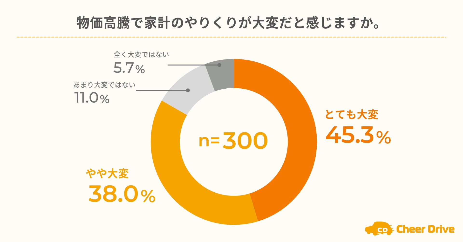 物価高騰で家計のやりくりが大変だと感じるか尋ねたところ、8割以上がやりくりが大変だと感じていることがわかりました(n=300)。