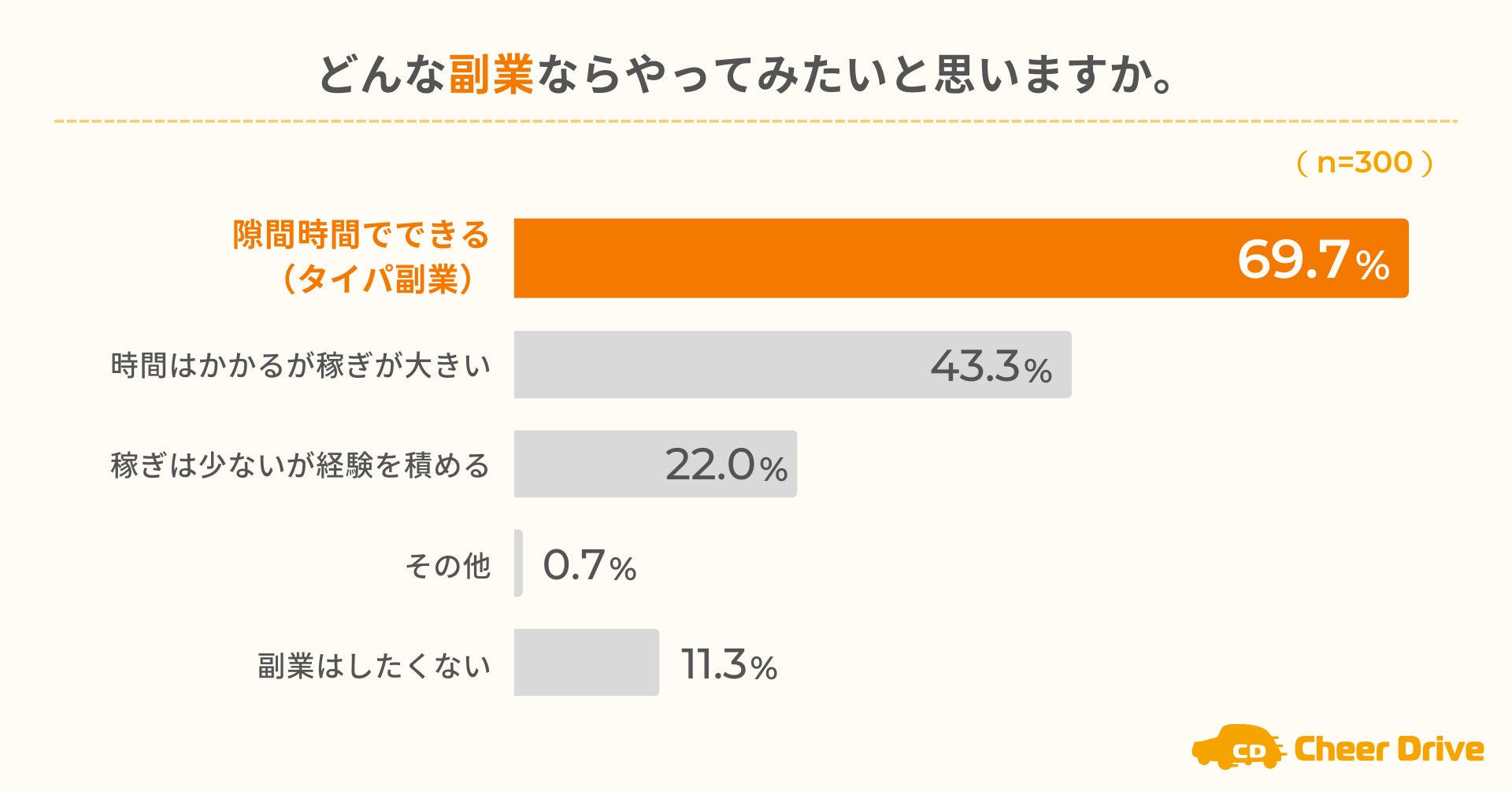 どんな副業ならやってみたいか尋ねたところ、「隙間時間でできる(タイパ副業)」が69.7%で最多となりました(n=300)。