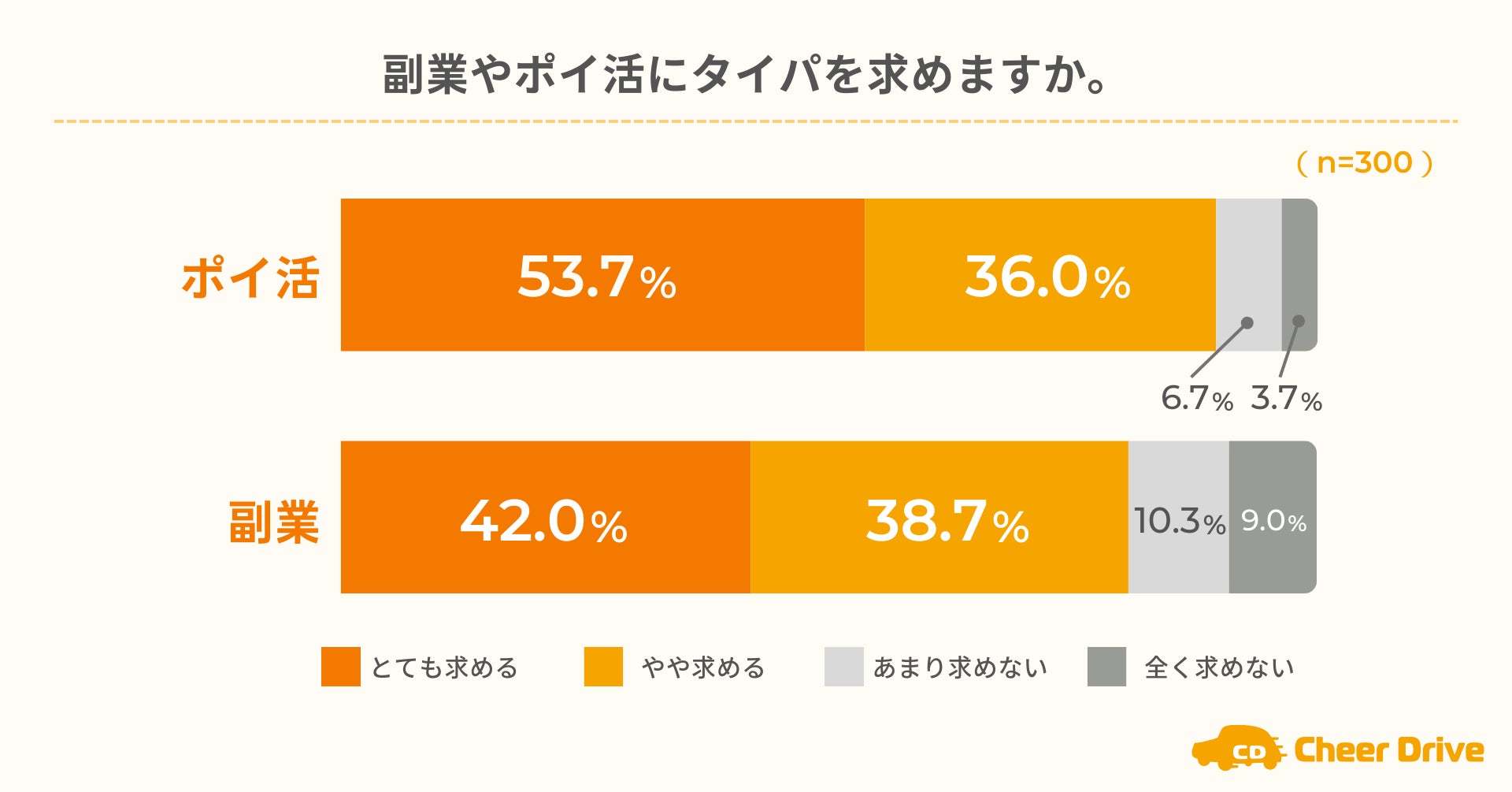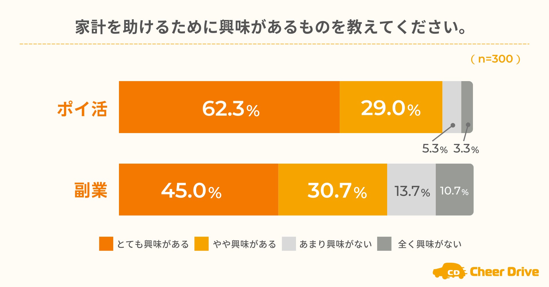 株式会社チアドライブ(本社:東京都中央区、代表取締役社長:保科昌孝、 http://cheerdrive.jp/ )は、自家用車を運転することのある20~40代の男女を対象に「ポイ活や副業に関するアンケート」を実施し、300名から回答を得ました。