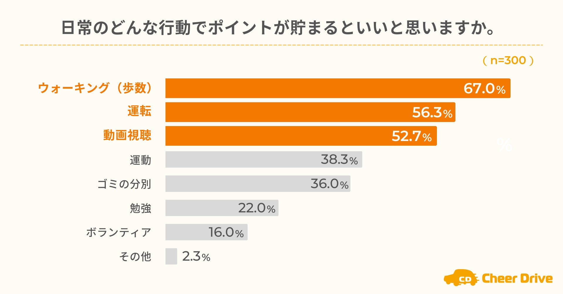 日常のどんな行動でポイントが貯まるといいと思うか尋ねたところ、「ウォーキング(歩数)」が67.0%で最も多く、「運転」が56.3%、「動画視聴」が52.7%と続きました(n=300)。