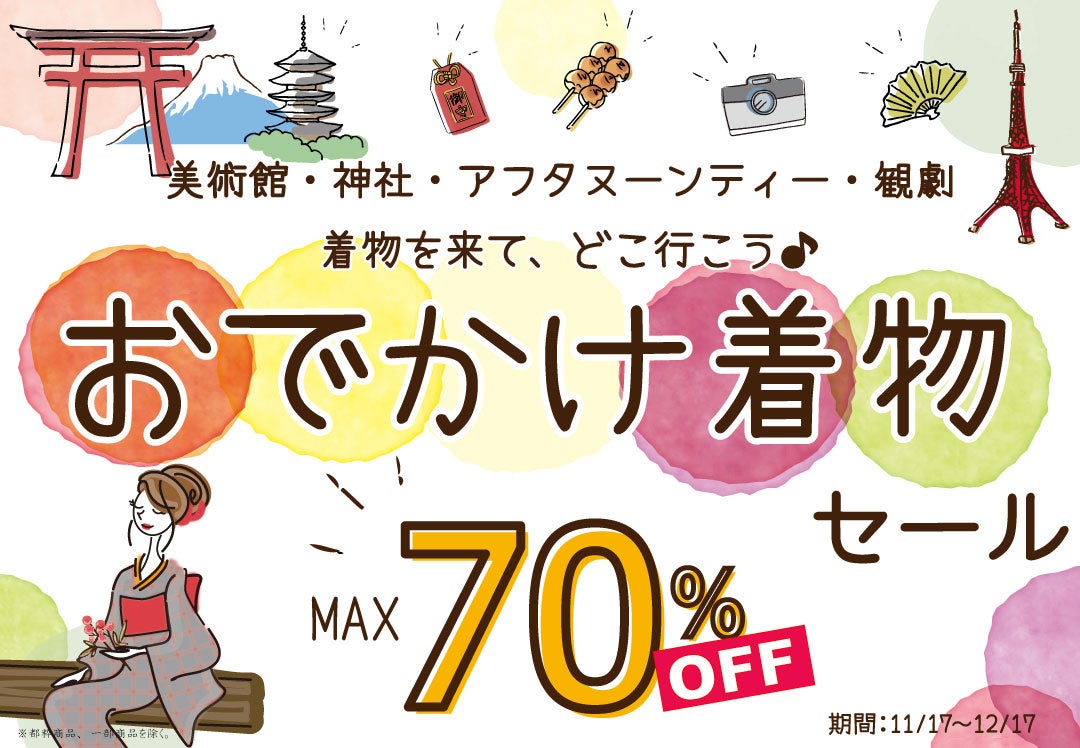 リユース着物「たんす屋オンラインストア」では 11月17日(金)~12月17日(日)の期間「おでかけ着物セール最大70%OFF」(一部商品を除く)を開催中です。