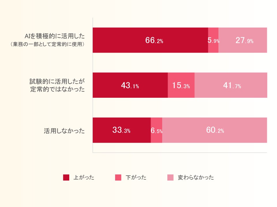 2024年に年収が上がったかどうかたずねると、「AIを積極的に活用した」層は6割以上が「上がった」と回答した一方、「活用しなかった」層は6割近くが「変わらなかった」と回答しました。