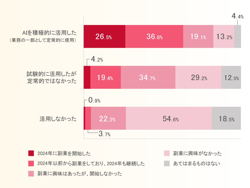 副業について見てみると、「AIを積極的に活用した」層は6割以上がすでに副業を実施しているのに対し、「活用しなかった」層は、5割以上がそもそも「副業に興味がなかった」と回答しています。
