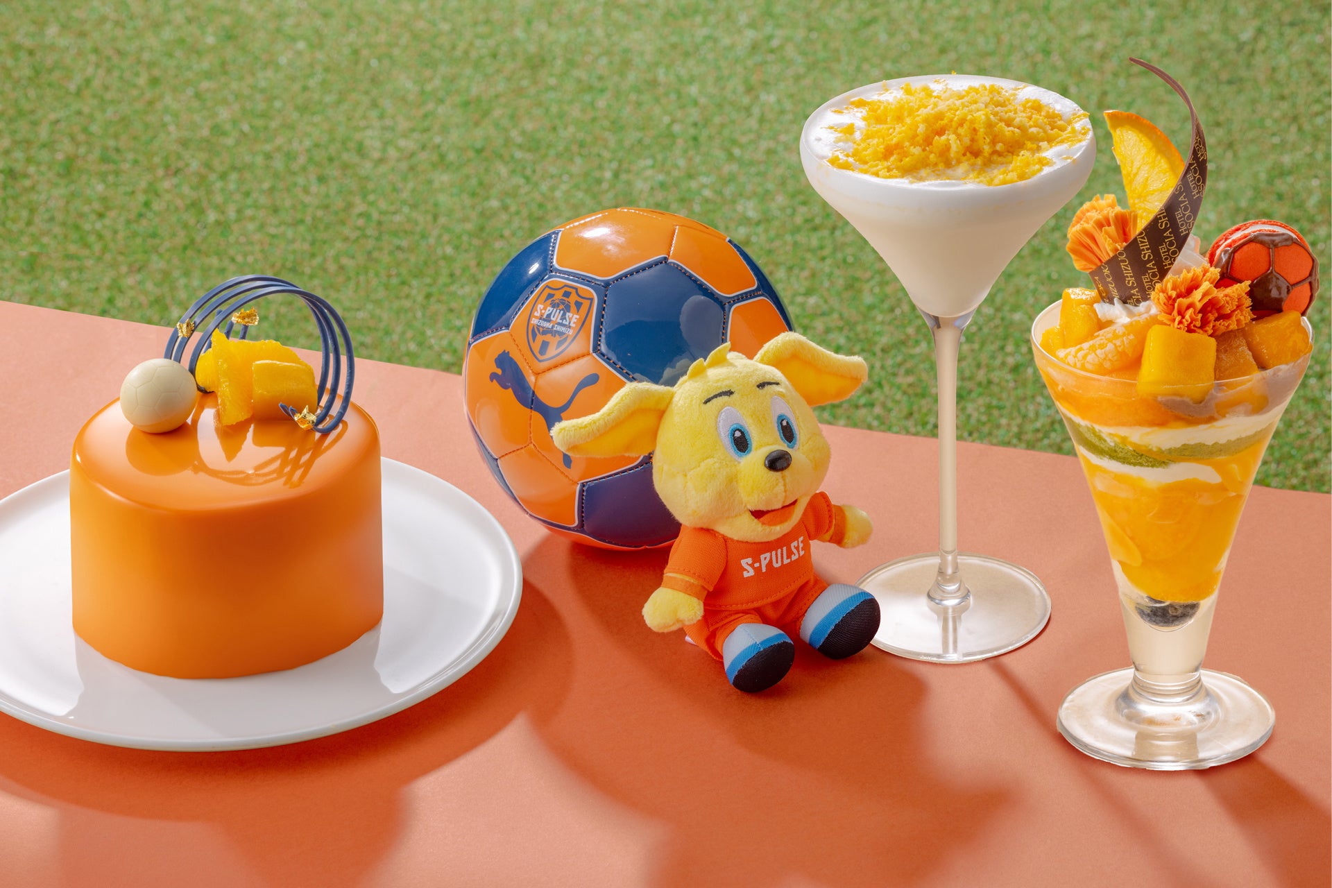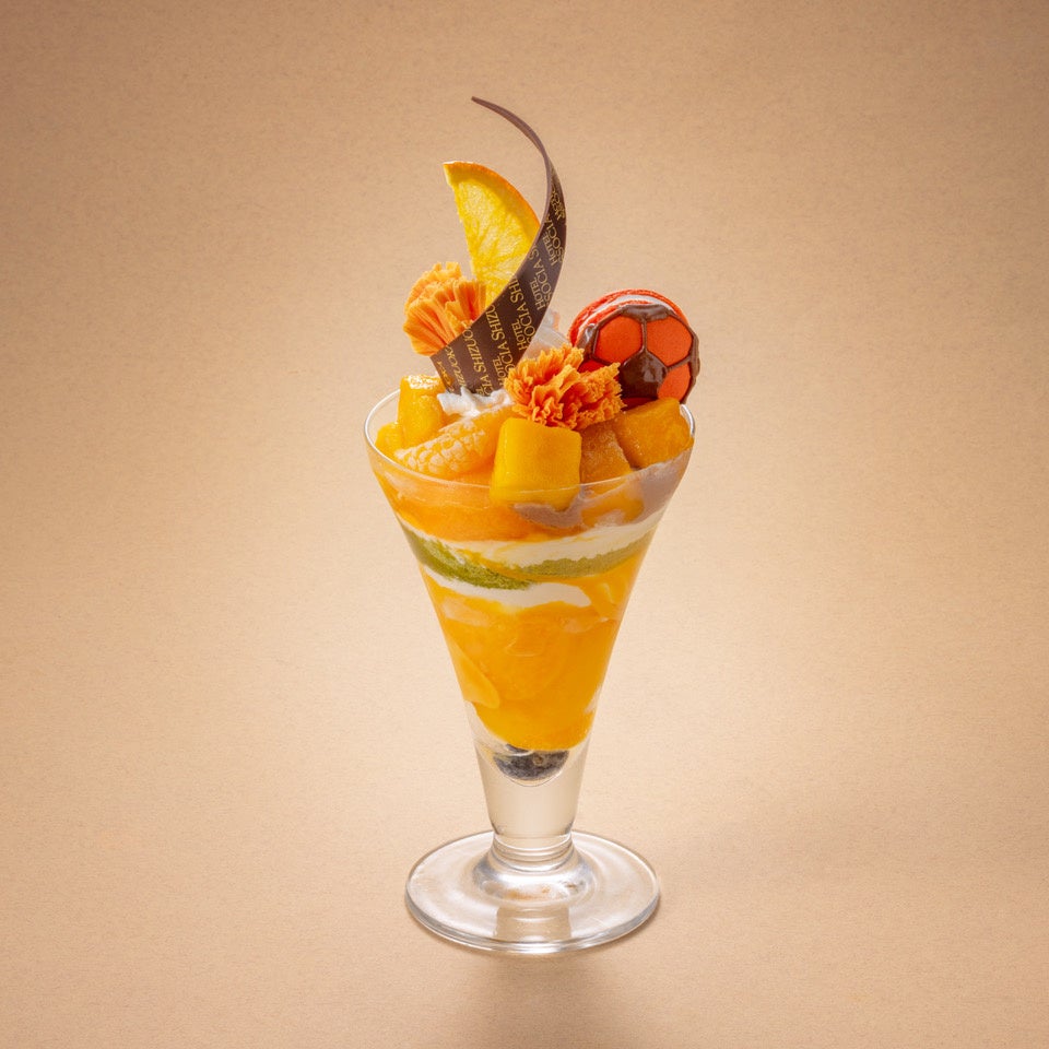 エスパルスのオフィシャルチアリーダー「オレンジウェーブ」をイメージし、トップにはオレンジ色のポンポンを模したチョコレートと、静岡県産みかんジャム入りのサッカーボールマカロンを飾りました。サッカーの1チーム11人にちなんで、11種類の素材を使用し、層ごとに異なる食感と味わいをお楽しみいただけます。