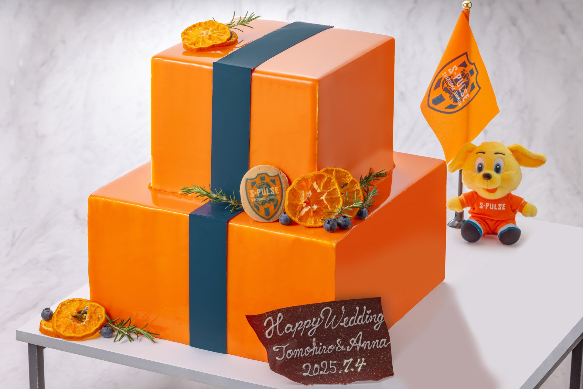 エスパルスオレンジのグラサージュとエンブレムが華やかなスクエア型の二段ケーキ。