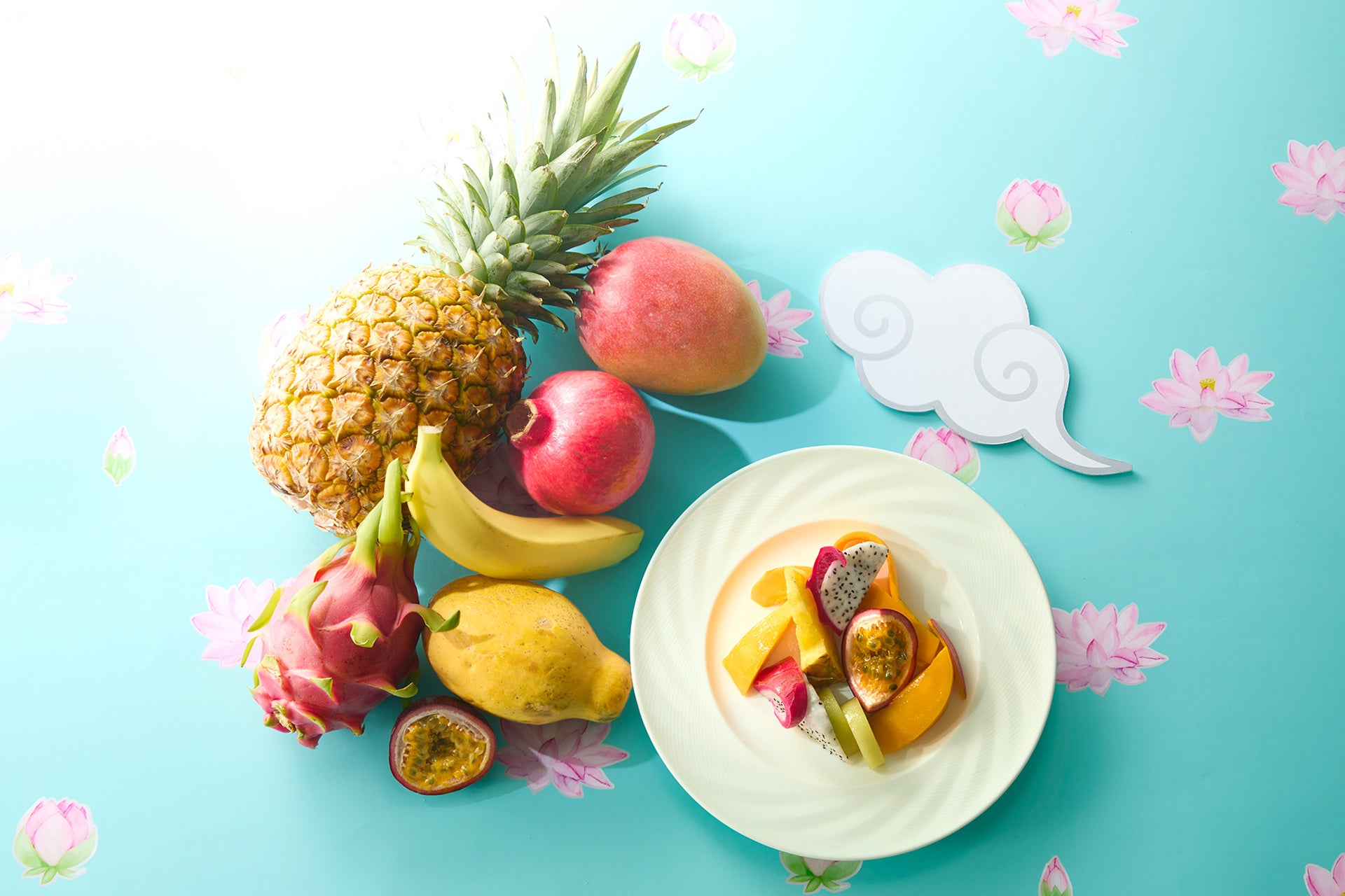 アフタヌーンティーには、食べる宝石とも言われるボール型ゼリーの九龍球をフルーツポンチにアレンジしたものや、マカオ式のパイ生地からできたエッグタルトをご用意しました。その他、香港発祥のマンゴープリンや、タイ発祥のスイートチリソースを使ったセイボリーなどもお楽しみいただけます。