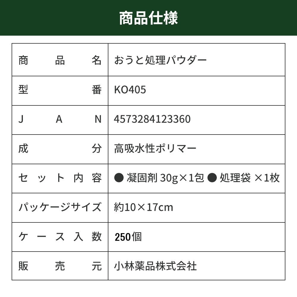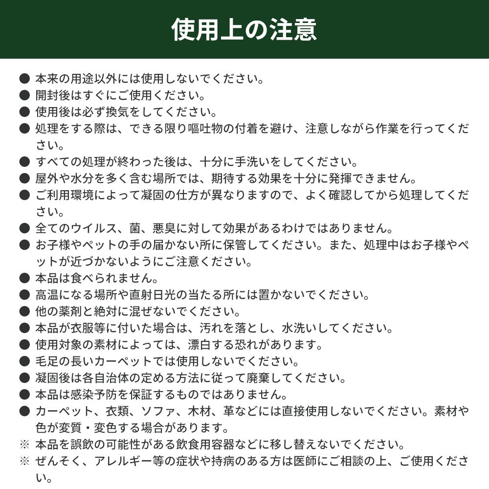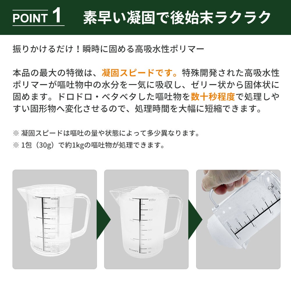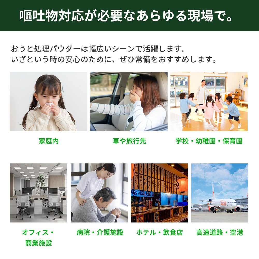 嘔吐物に振りかけるだけで瞬時に固め、清掃作業の負担を大幅に軽減します。強力な除菌・消臭成分により衛生的かつ安全に回収・廃棄が可能です。専用処理袋付きで手を汚さず、面倒な拭き取り作業も不要です。学校・病院・介護施設・飲食店など様々な現場でどなたでも簡単に活用できます。