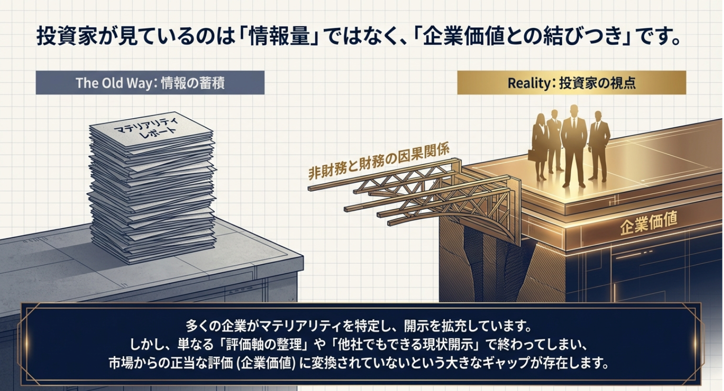 投資家が知りたいのは、個々のESG施策の網羅性だけではなく、企業が定めたマテリアリティが、どのように事業競争力、財務成果、そして将来の企業価値向上につながるのかという因果関係です。
