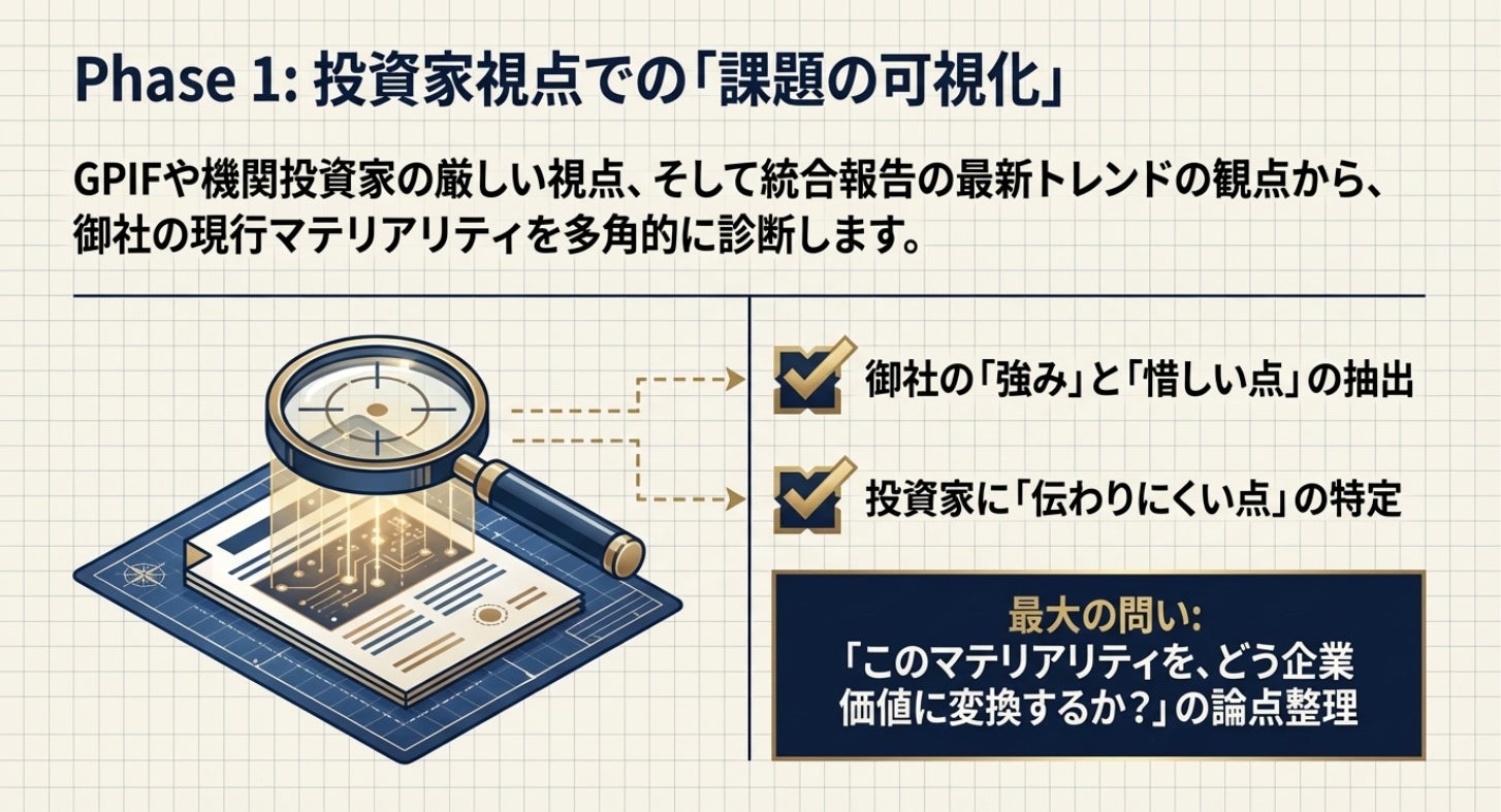 診断で見えた課題を踏まえ、3か月間で企業価値向上に資するマテリアリティ再設計・開示高度化を支援します。