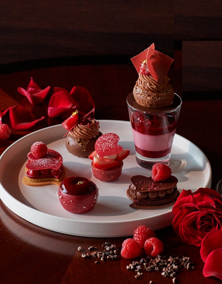 輝くガーネット色のスイーツや、奥深くも艶やかなショコラの数々は、エグゼクティブペストリーシェフ青木 裕介が担当いたしました。ショコラアフタヌーンティーには、世界中のプロフェッショナルから絶大な信頼を得るフランスの高級ショコラブランド「ヴァローナ」の厳選された数々のショコラを使用し、想像を超えたショコラの奥深さをご実感頂けます。