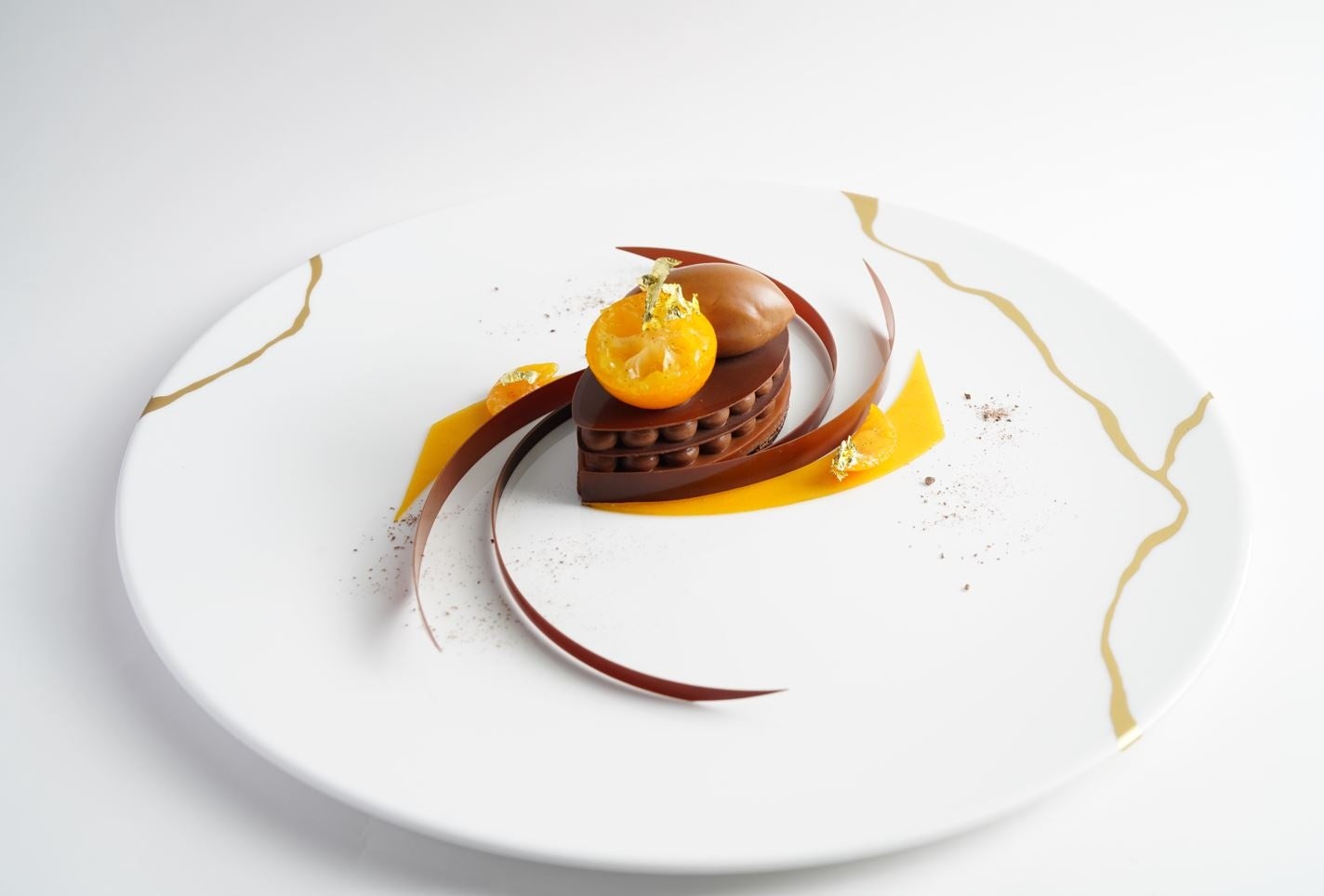 ショコラが美しい層をなしながら、湾曲されたフォルムに旬のフルーツである金柑やオレンジを合わせ芸術性溢れる一皿に仕上げております。力強いウッディノートとカカオ特有のロースト香が際立つ、唯一無二のアロマもお愉しみください。