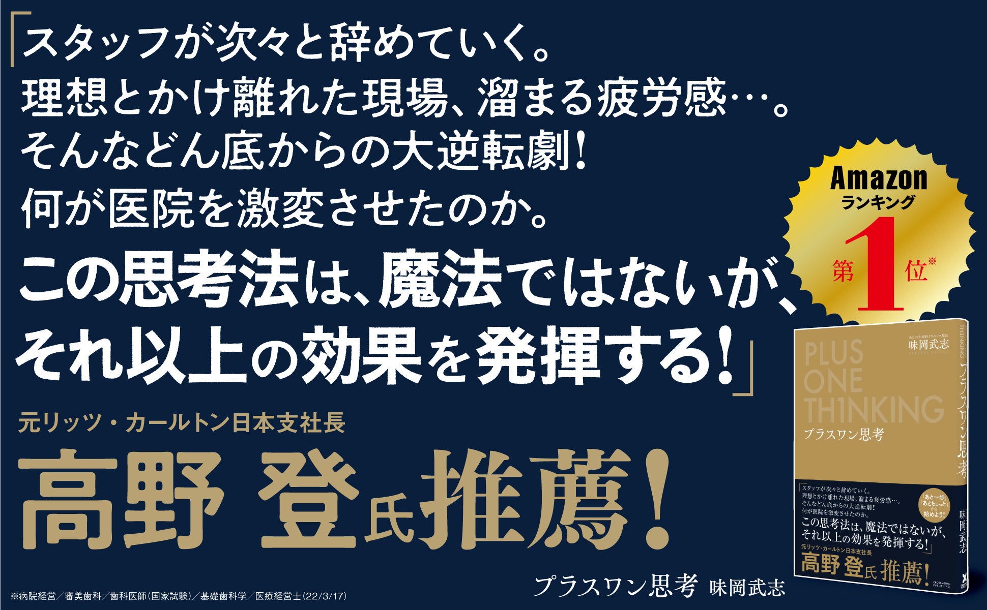 【5/26(木) 高野登氏と対談 出版記念セミナーあり】元リッツ・カールトン日本支社長の高野登氏推薦!現役歯科クリニック院長による新刊『プラスワン思考』2022年3月28日(月)発売!