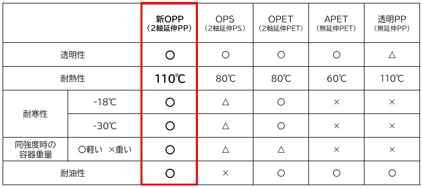 一般的に2軸延伸PPフィルムは、主に食品用軟包装資材用途として厚さ30ミクロンから50ミクロンで使用されております。今回当社が開発した新OPPシートは、150ミクロンから300ミクロンの厚さと なります。この新OPPシートは優れた透明性、耐熱性、耐寒性や耐油性のみならず、極低温から高温まで 幅広い温度域における剛性と耐衝撃性の高い物性バランスを発現しています。これらの特徴を活かして、 これまでに無い食品容器の開発が可能となります。