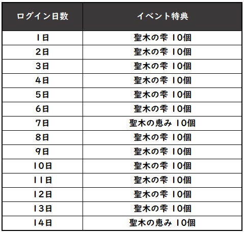 全期間ログインすると、最大で120回召喚分の「聖木の雫」も獲得できますので、欠かさずログインしましょう!