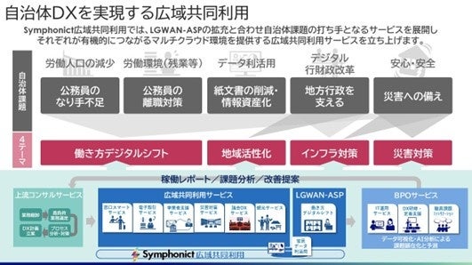 このたび当社が本格展開を開始する広域共同利用サービスは、こうしたニーズに応えるもので、当社が自治体向けに提供するサービス群を複数自治体の共同利用という形で提供することにより、導入コストと運用負担の軽減に貢献します。加えて、当社が企業向けDXソリューションの提供で培ってきたノウハウを結集したSymphonictのマルチクラウド環境を活用することで、各種クラウドサービスのスムーズな連携によるシームレスなデジタル化を実現します。