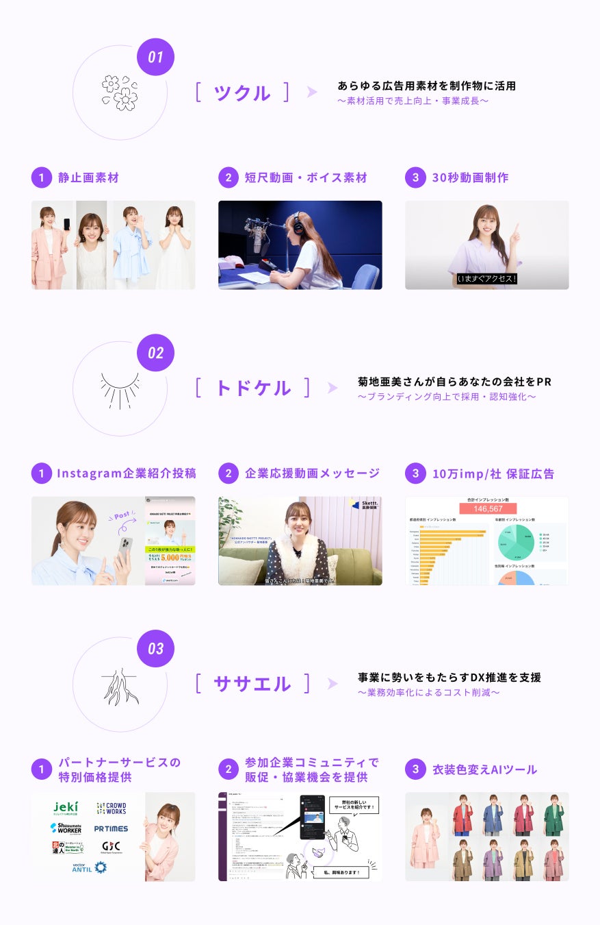 具体的には、地方出身のタレントの静止画/動画素材(ツクル)、タレントによるSNSでの告知や応援動画メッセージ(トドケル)、各パートナー企業によるサービス優待(ササエル)といった、さまざまなサポートがセットになった、革新的なプランです。