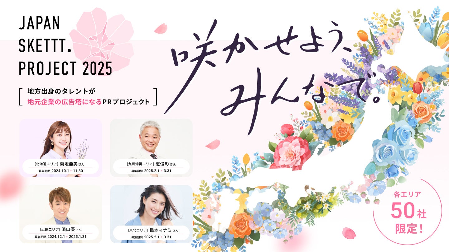 「JAPAN SKETTT. PROJECT(ジャパン・スケット・プロジェクト)」は、「咲かせよう、みんなで」をキャッチコピーに、地方出身タレントがPRでお困りの地元企業さまを支援するプロジェクトです。