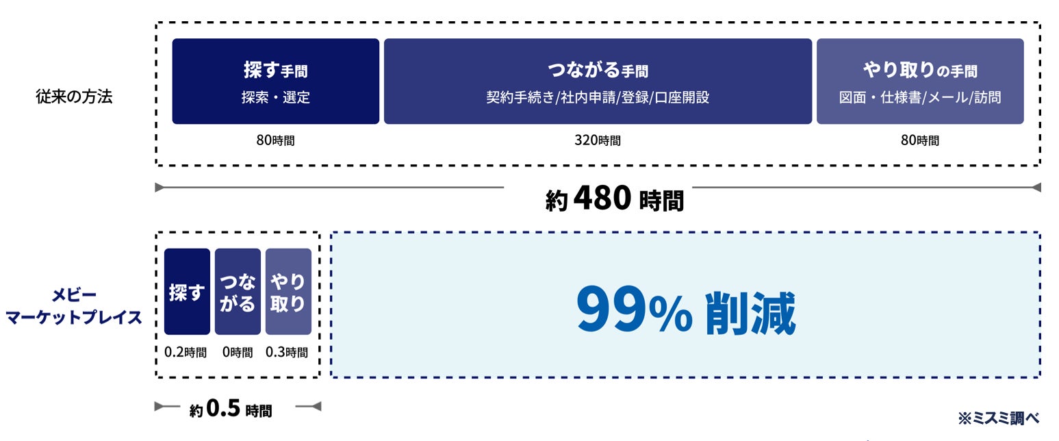 meviyマーケットプレイスは、”あらゆる機械加工部品をワンストップで手間なく”手配できる“日本最大級の製造業マーケットプレイス”です。設計データをアップロードするだけで、『AIマッチング』により条件に合致した製造パートナーをリコメンド、製造パートナーとの取引口座開設なども必要なく、取引も「デジタル完結」するため、「探す手間」「つながる手間」「やり取りの手間」を大幅に削減することが可能です。