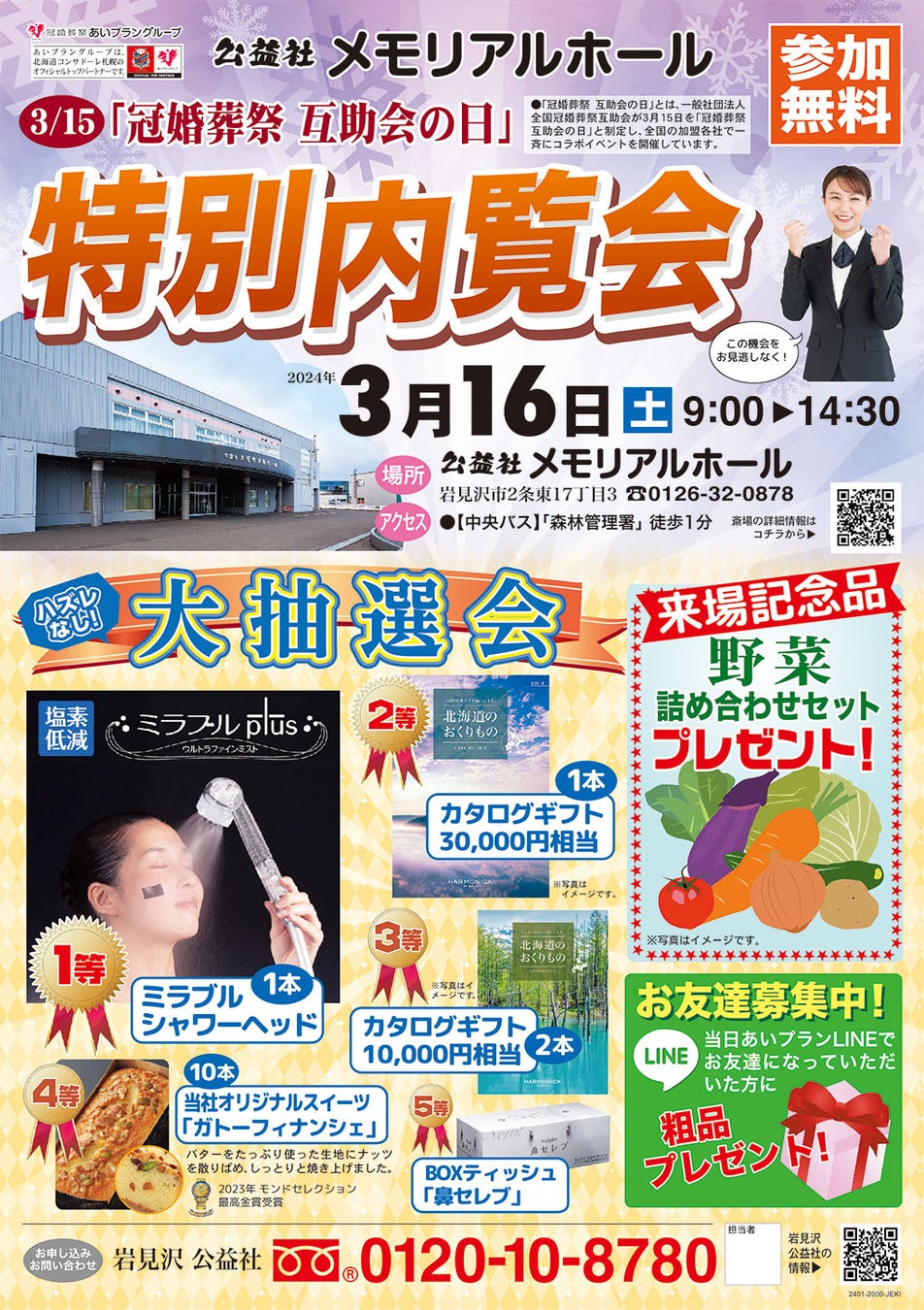 「冠婚葬祭互助会の日」を記念して3/16に特別内覧会を開催いたします。豪華賞品が当たる大抽選会や来場記念品など楽しい企画をご用意しております。