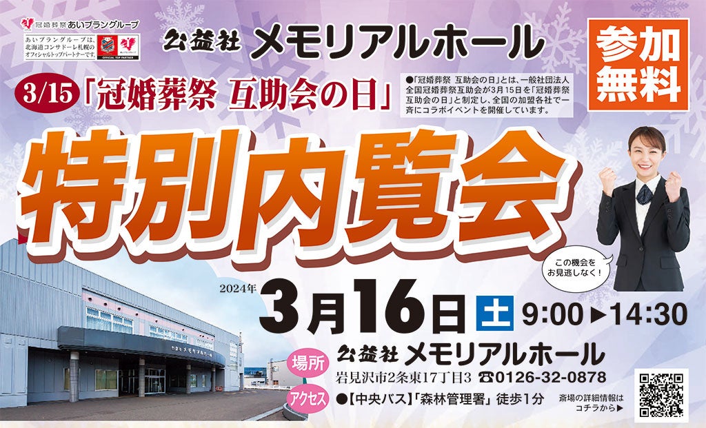 株式会社あいプラングループの公益社メモリアルホール(北海道岩見沢市2条東17丁目3)にて開催します。施設内をじっくりご見学いただけるほか、葬儀や法要に関するご相談・お見積りも承ります。