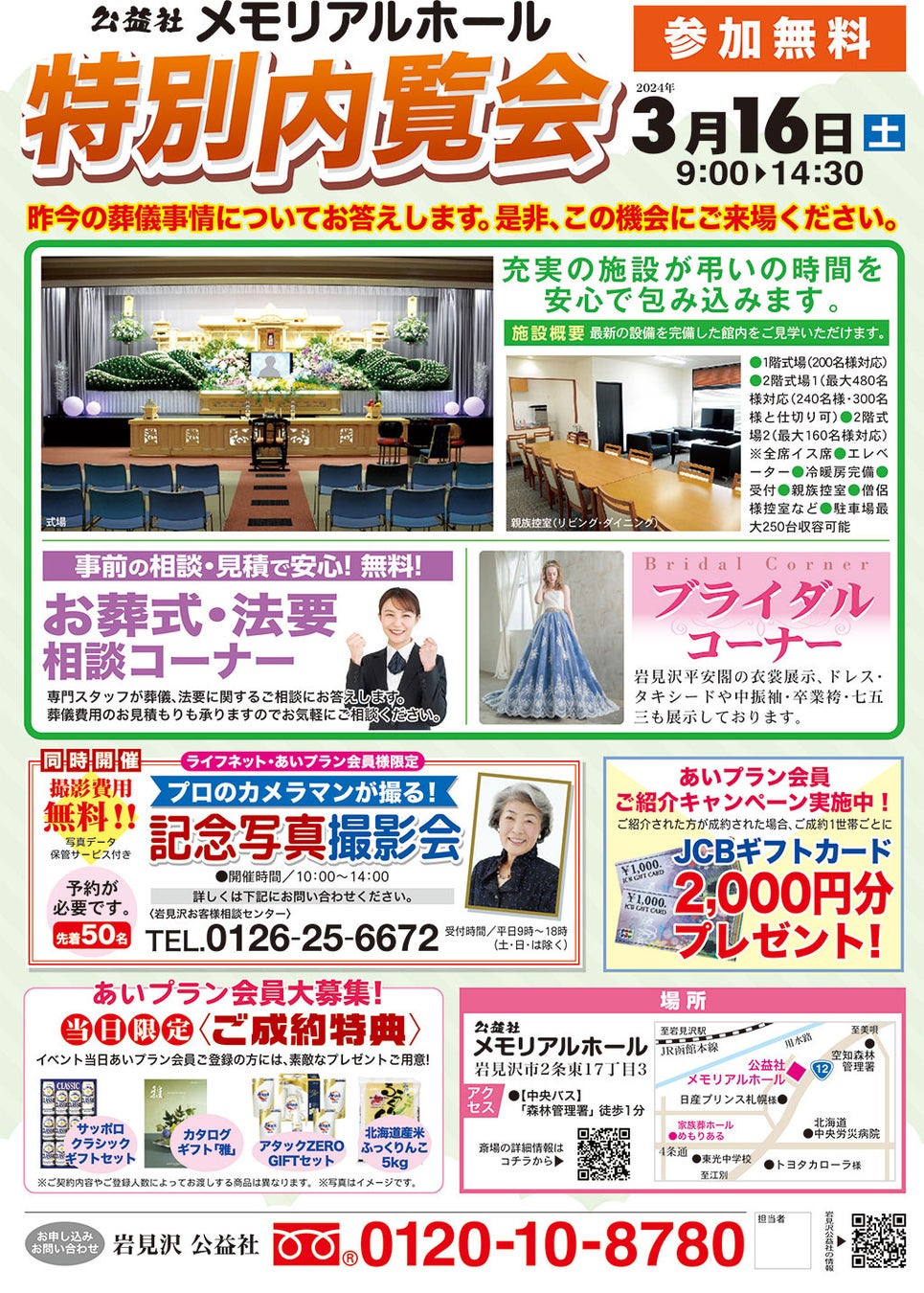 また、当日はお葬式や法要のご相談コーナー、岩見沢平安閣の結婚式をご紹介するブライダルコーナーなどもございます。同時開催の記念写真撮影会は人気のイベントなので、参加をご希望の方は早めのご予約がおすすめです。