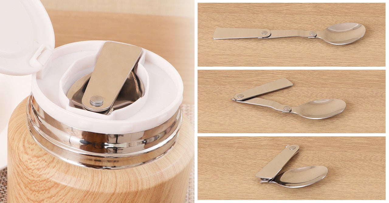 口当たりのいいステンレスのスプーンは折りたたみ式となっていて、内蓋に収納でき便利。スープジャーだけスマートに持ち歩けます。