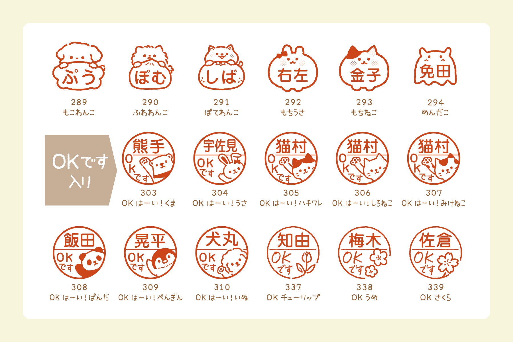 めんだこ、うさぎ、ねこをモチーフにしたデザインは、丸みのあるフォルムが特長です。イラストの中や横に名前が入るため視認性が高く、確認印としても実用的。かわいさはありつつも主張しすぎず、学校・塾・オフィスなど、場所を選ばず使えます。