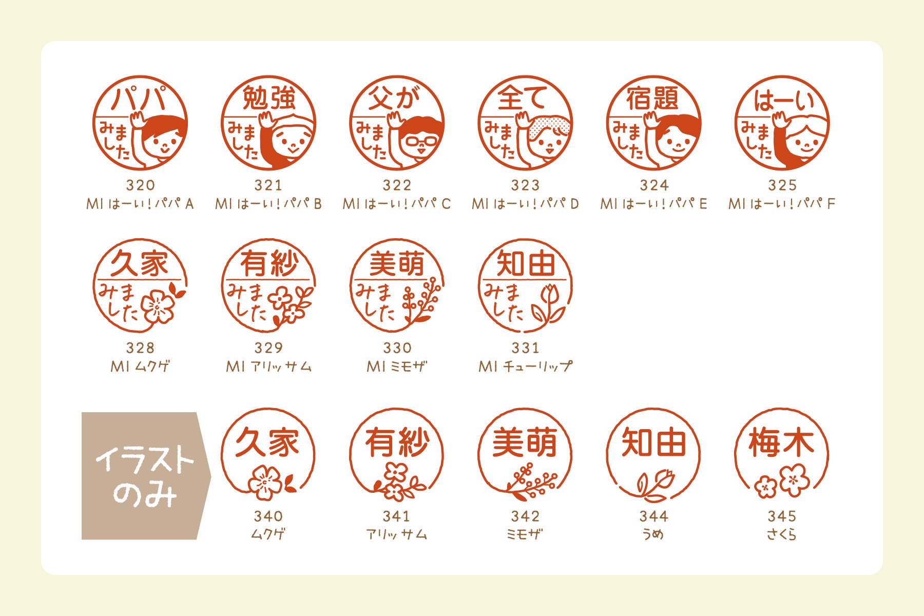 ショップで人気の、シンプルながら手描き風のかわいい「ぷちシリーズ」デザインを印鑑サイズに合わせて展開しました。すべて当店のイラストレーターが作成したオリジナルです。保護者さまをイメージした、パパママの顔が描かれたデザインも入った全353デザインです。