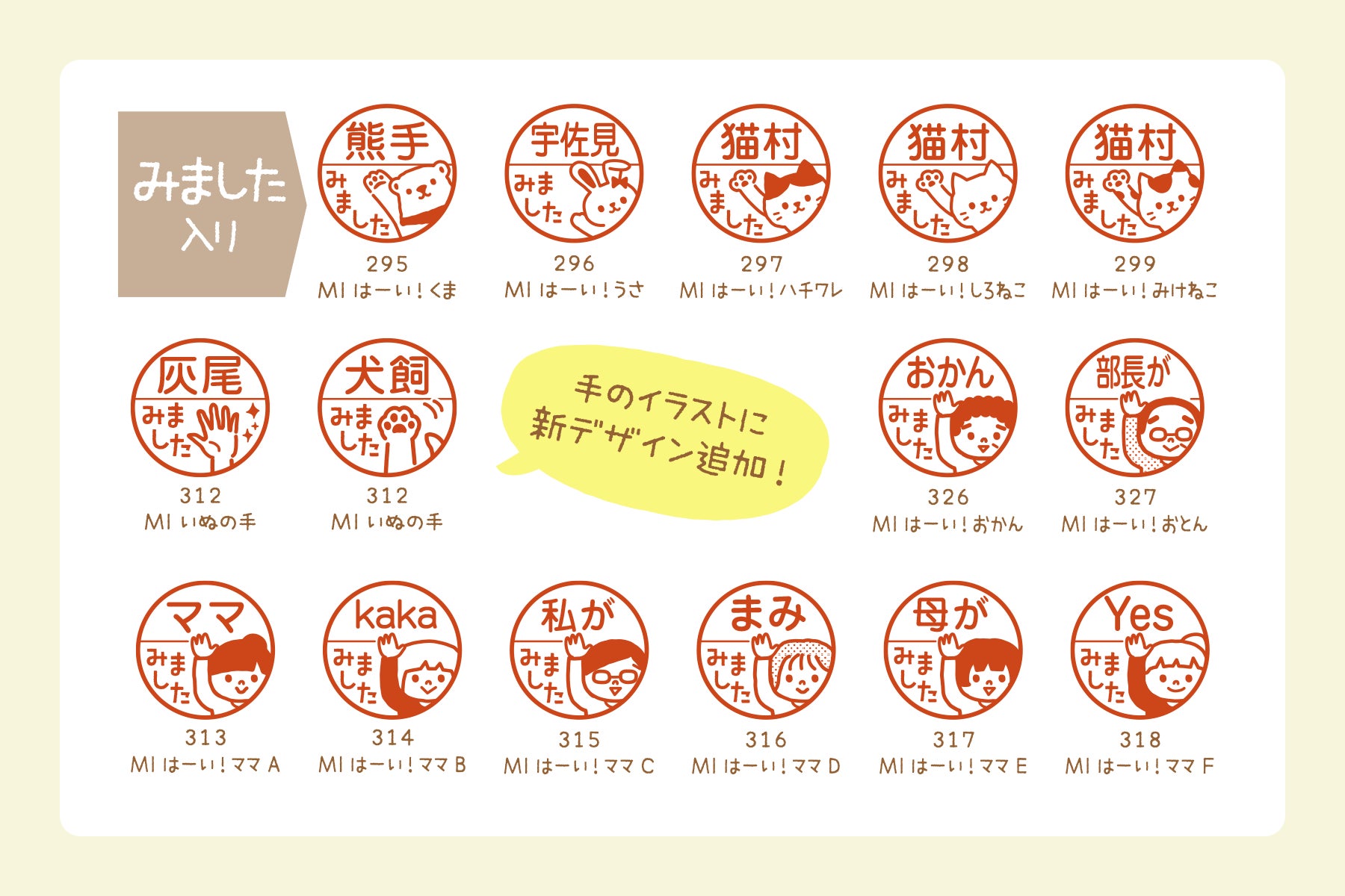 「みました」「OKです」などの文字入りデザインに加え、名前のみを入れられるタイプも揃え、用途に合わせて選べます。