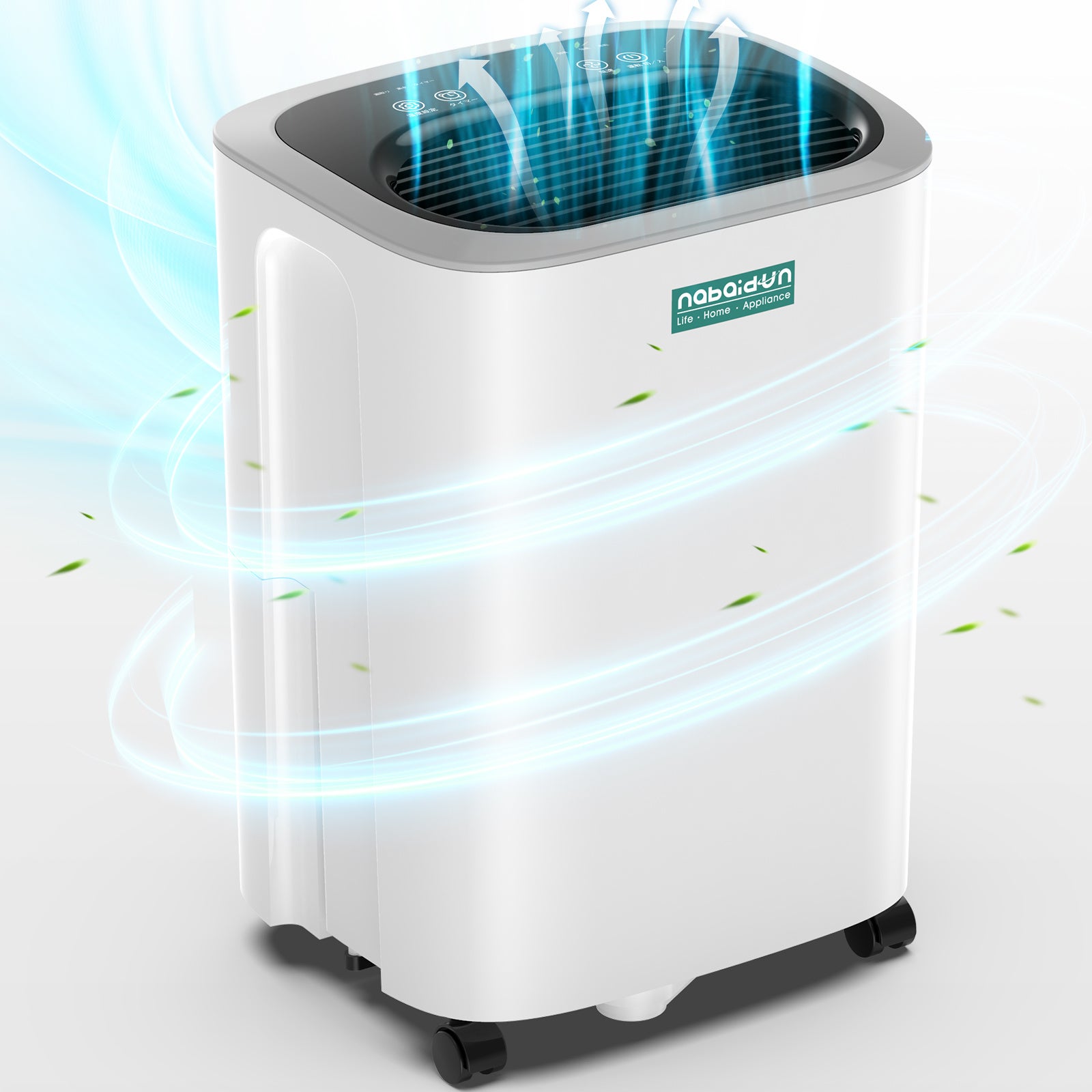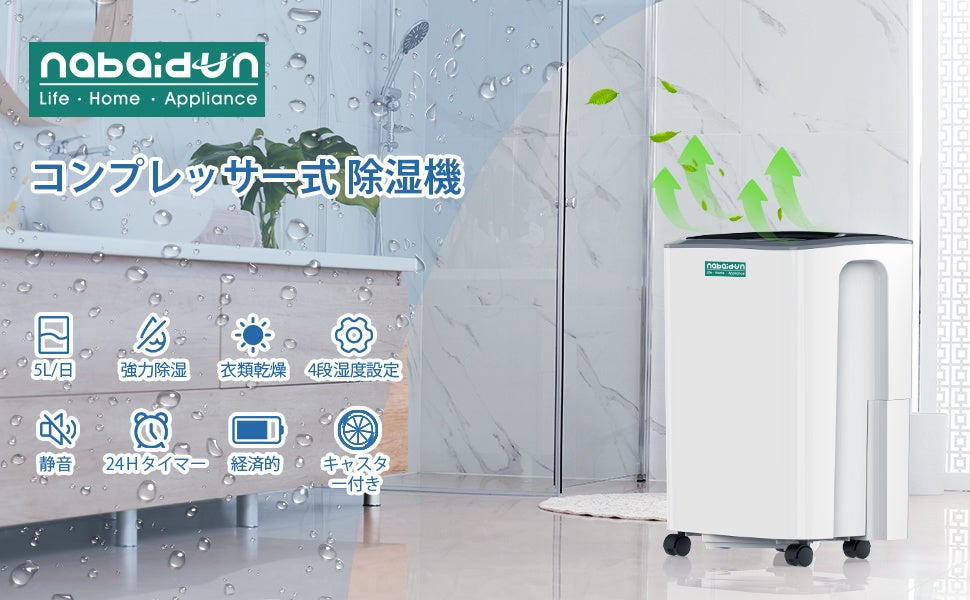 本体左右のところにバントルがあり、4輪キャスター付き、簡単的移動ができます。台所、寝室、お風呂場など湿度が高く場所に効率よく除湿します。
