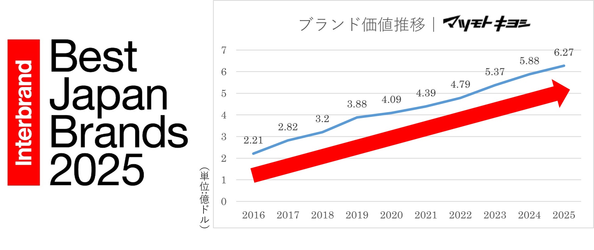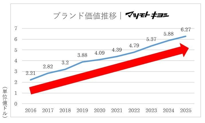 当ランキングにおいて、「マツモトキヨシ」のブランド価値は、昨年の5.88億ドルから6.27億ドルと大きく拡大し、10年連続のランクインとなりました。また、前年度からのブランド価値成長率は+7%となりました。