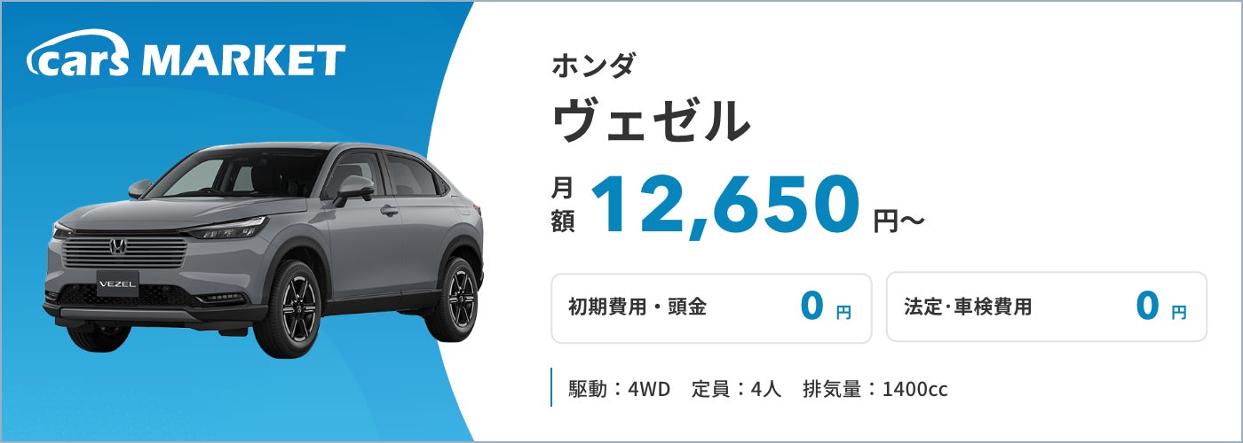 洗練されたスタイルと上質な乗り心地が魅力のホンダ「ヴェゼル」は、コンパクトSUVとして安定した人気を誇る一台です月額12,650円〜というコスト感で、都市部での運転のしやすさと、週末のドライブにも対応する走行性能を両立。広めの室内空間と荷室容量もあり、日常使いからレジャーまで活躍の幅が広いモデルです。