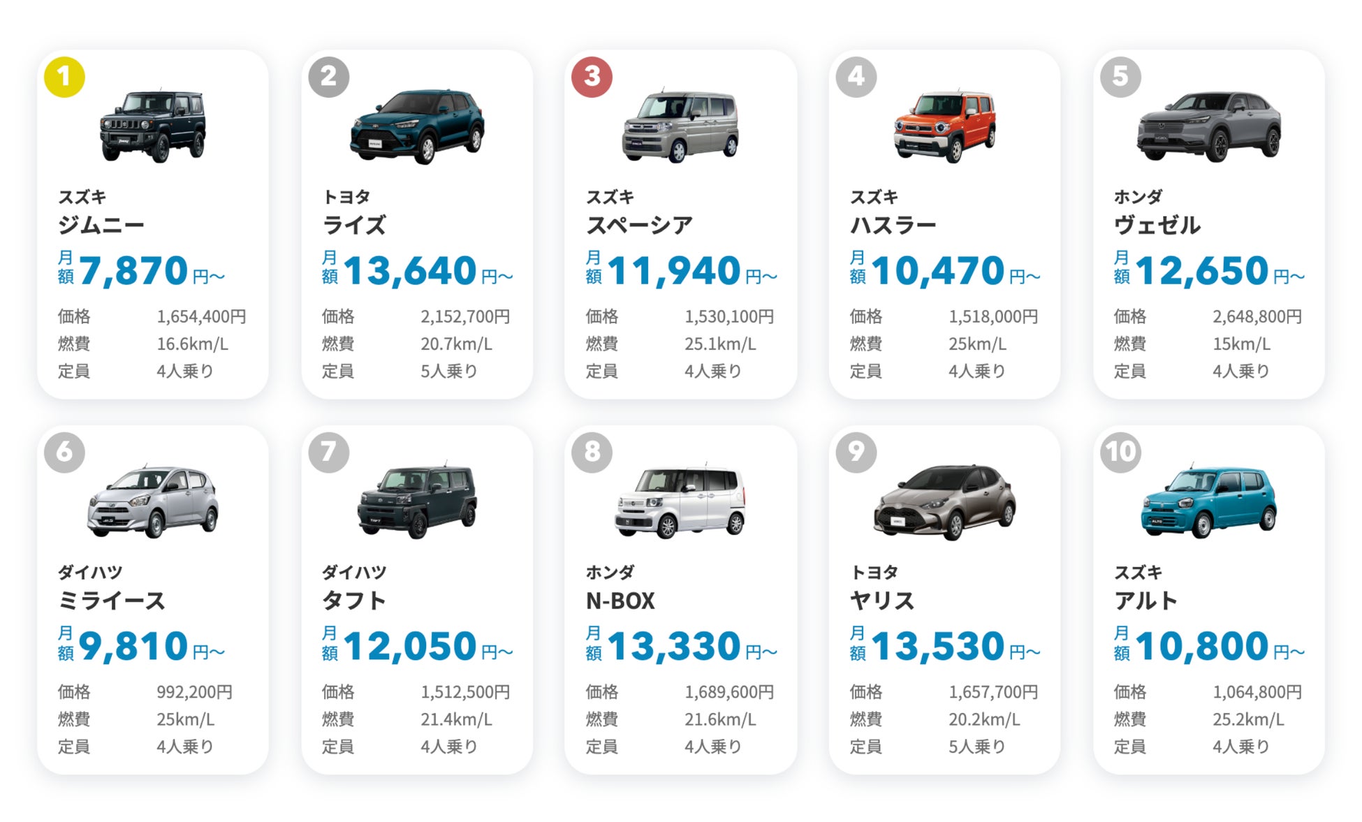 ランキングは、マイカー定額プランに寄せられた実際の申込データをもとに集計。今月も、日常の移動手段として使いやすい軽自動車やコンパクトSUVが上位を占め、ユーザーの関心が集まっています。