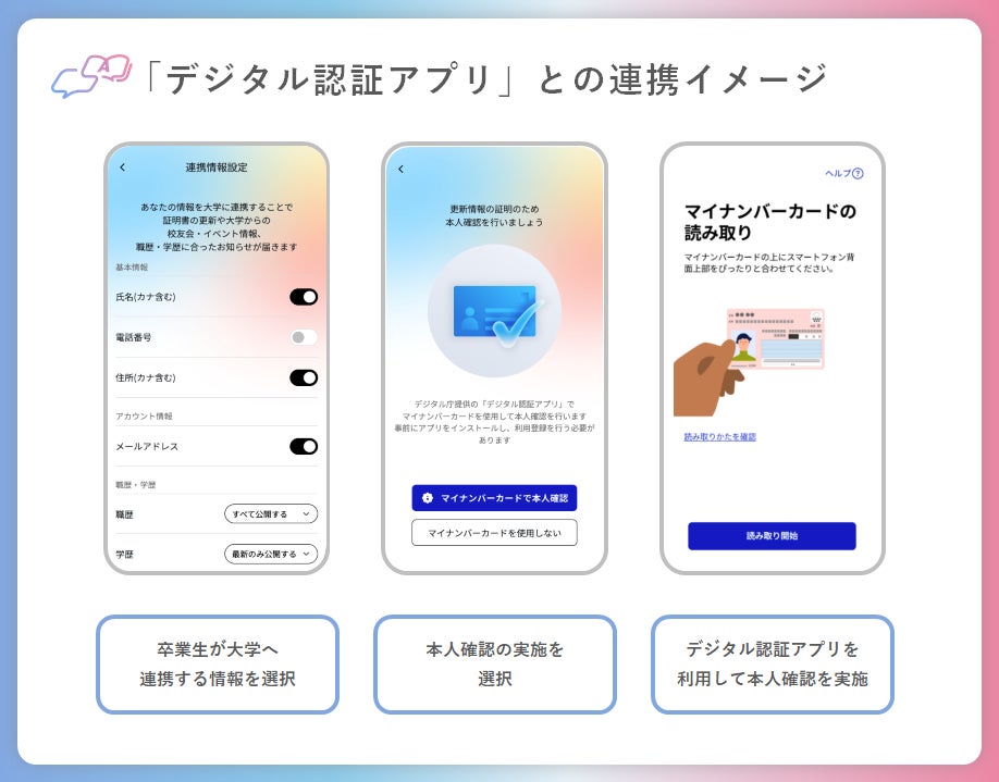 また、マイナンバーカードの利用シーンが広がっており、全国でマイナンバーカードの交付率が75%(※3)を超えている状況であること、そして2024年6月にデジタル庁から「デジタル認証アプリ」の提供が開始されたことを受け、「卒業生情報変更」機能のリリースにおいて、セキュリティレベルの向上と卒業生の本人確認処理の簡素化、大学の本人確認作業の効率化のため、「デジタル認証アプリ」との連携を実現いたしました。