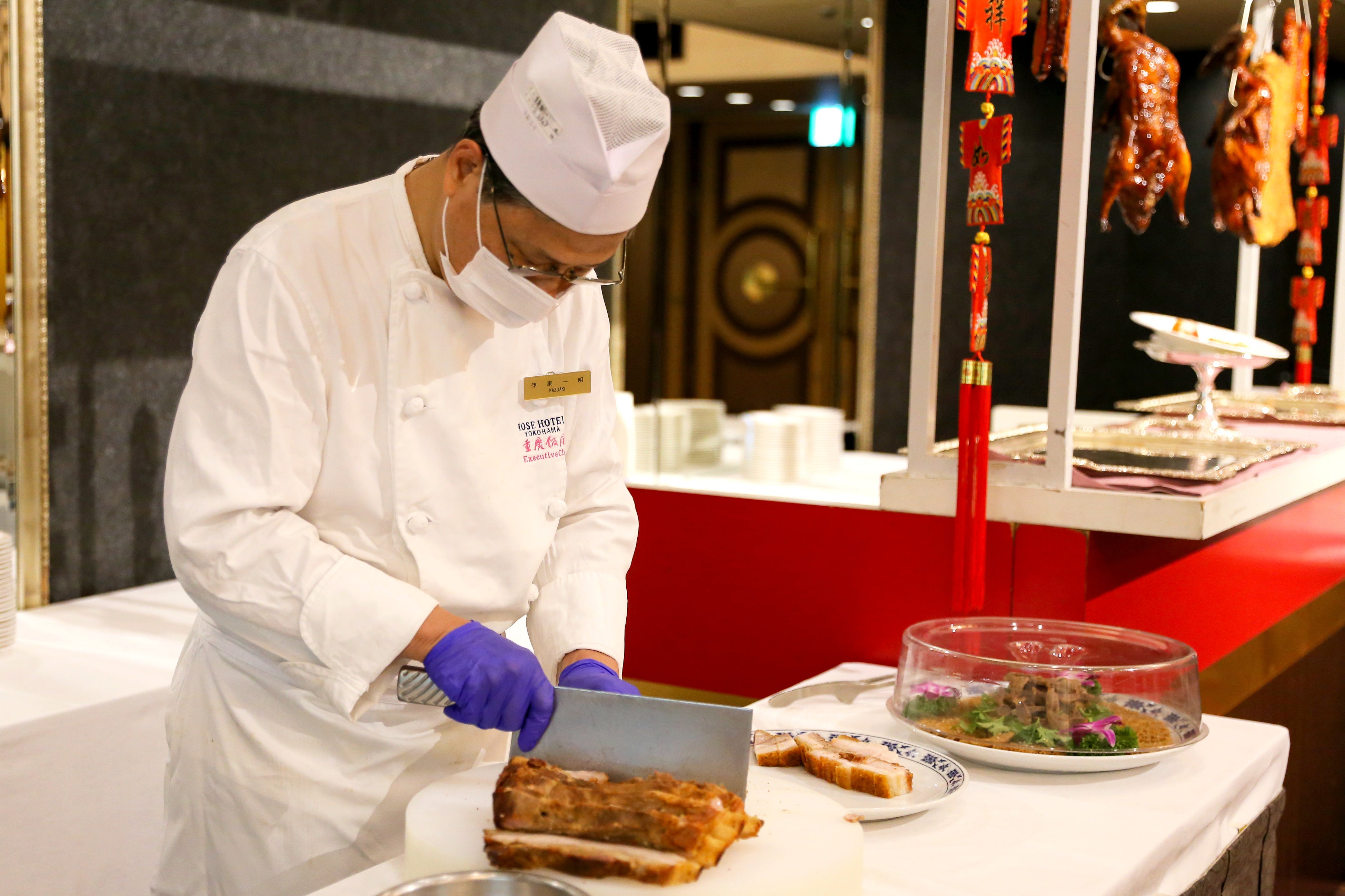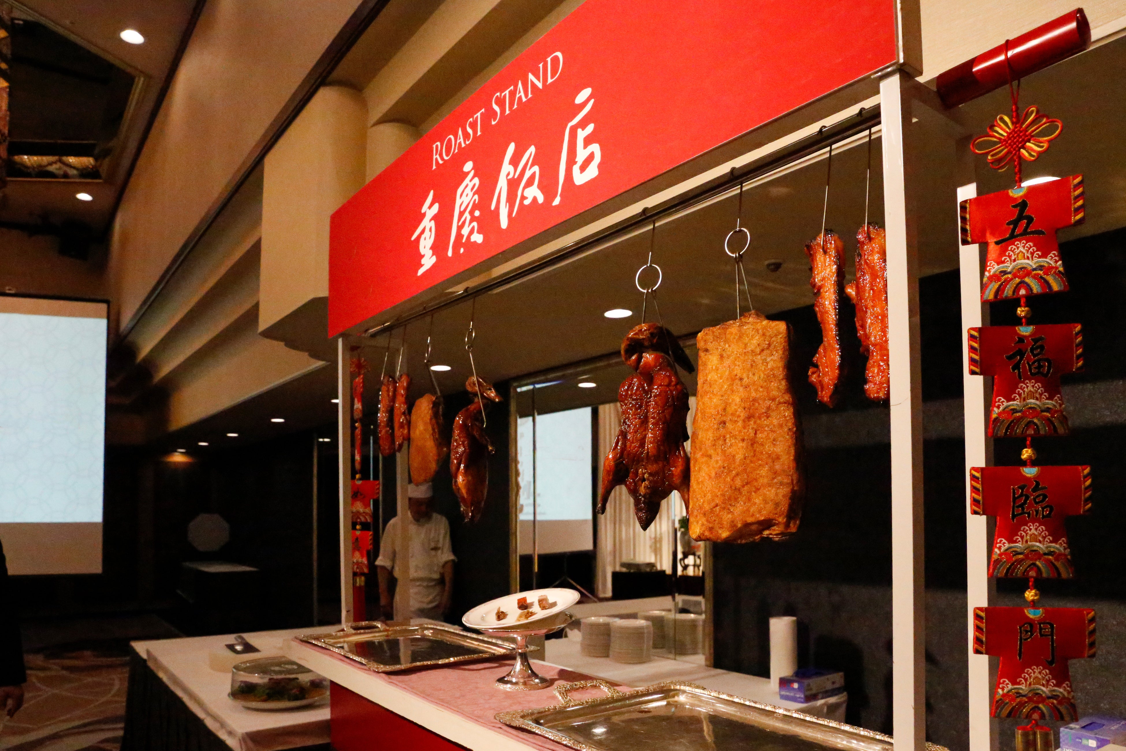年の初めに相応しいお料理には、ローズホテル横浜自慢の洋食料理と横浜中華街 重慶飯店の中華四川料理に加え、ホテルパティシエによるデザートなどご家族みなさまで楽しめる多彩な料理が勢揃いいたします。2026年のシェフサービスは、重慶飯店本館売店で販売している焼き物をローズホテル横浜の会場にてお客様の目の前でカッティングする「チャーシュースタンド」にご注目ください。