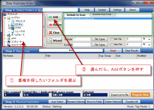 Step1:重複を探すフォルダを選び、「Add」をクリックし、「File Type」からファイルの種類を指定して「Start」を押します。