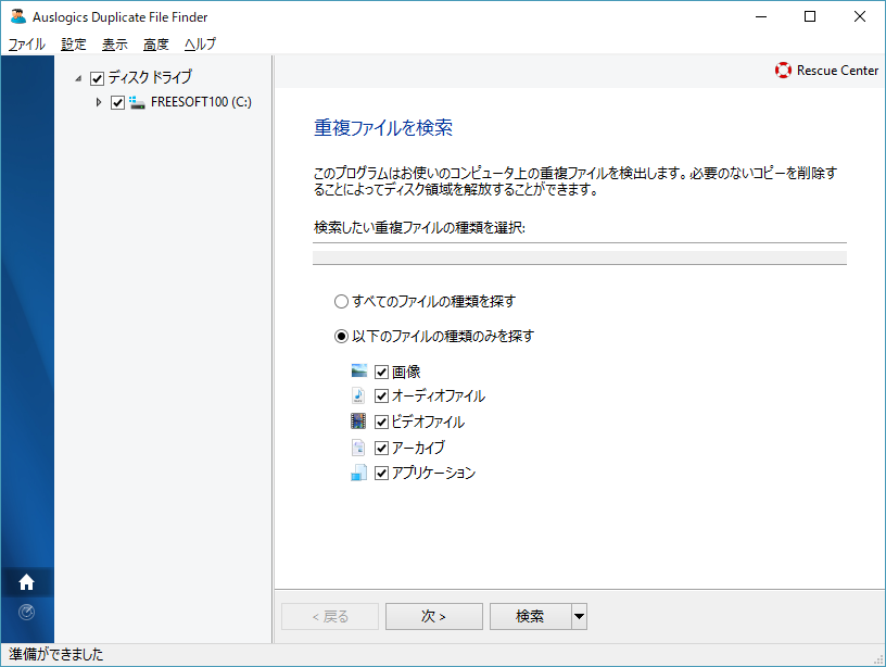 Step1:重複ファイルを検索する画面が表示されますのでファイルの種類や細かい検索条件を設定した後、「検索」をクリックします。
