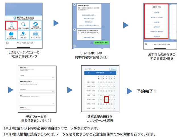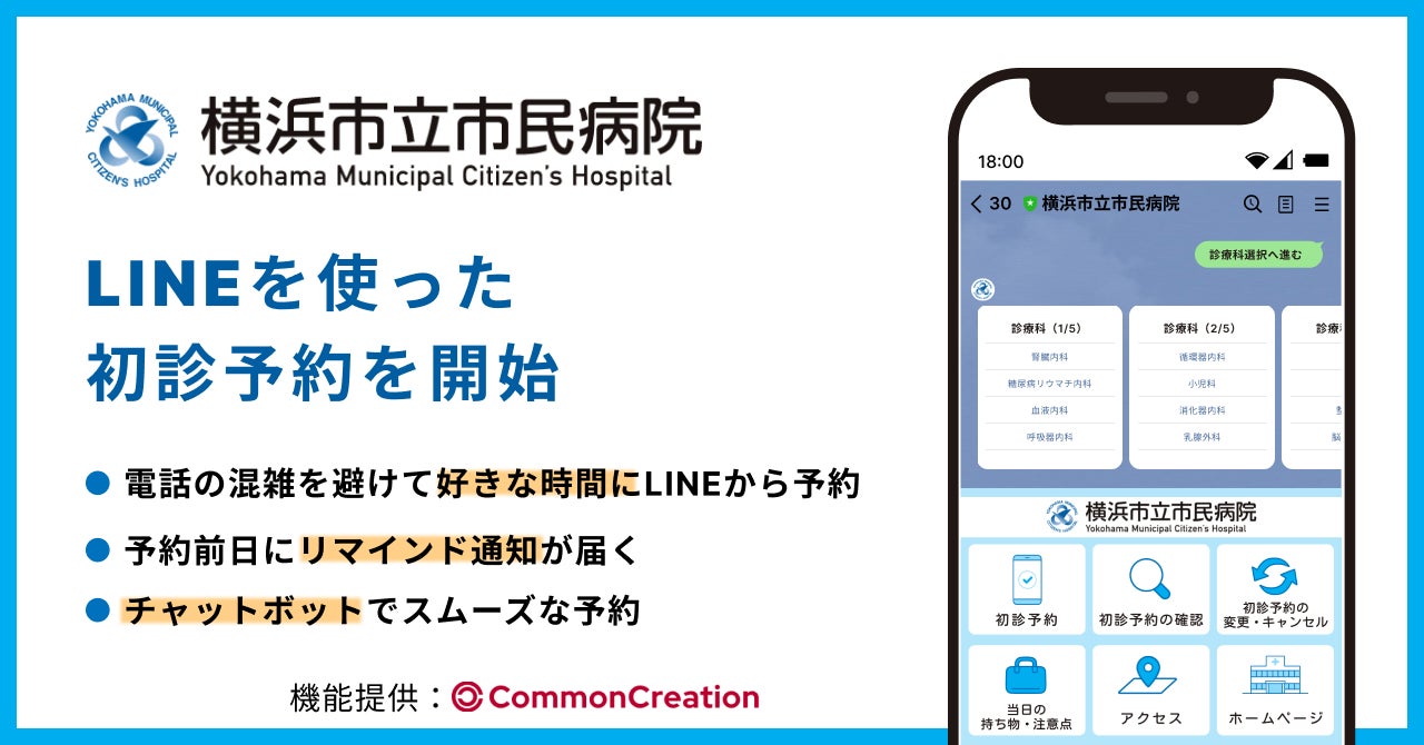 横浜市立市民病院(病院長:中澤 明尋(なかざわ あきひろ))は、コモン・クリエーション株式会社(本社:福岡県福岡市、CEO:牟田 和貴(むた かずき))の予約システム「Med-Well」※を採用し、「LINEを活用した初診予約システム」を新たに導入します。同システムの導入は、いつでも予約ができることで患者さんの利便性向上と事務の効率化が期待され、「患者満足度の向上」と「医療DXによる働き方改革」につながります。