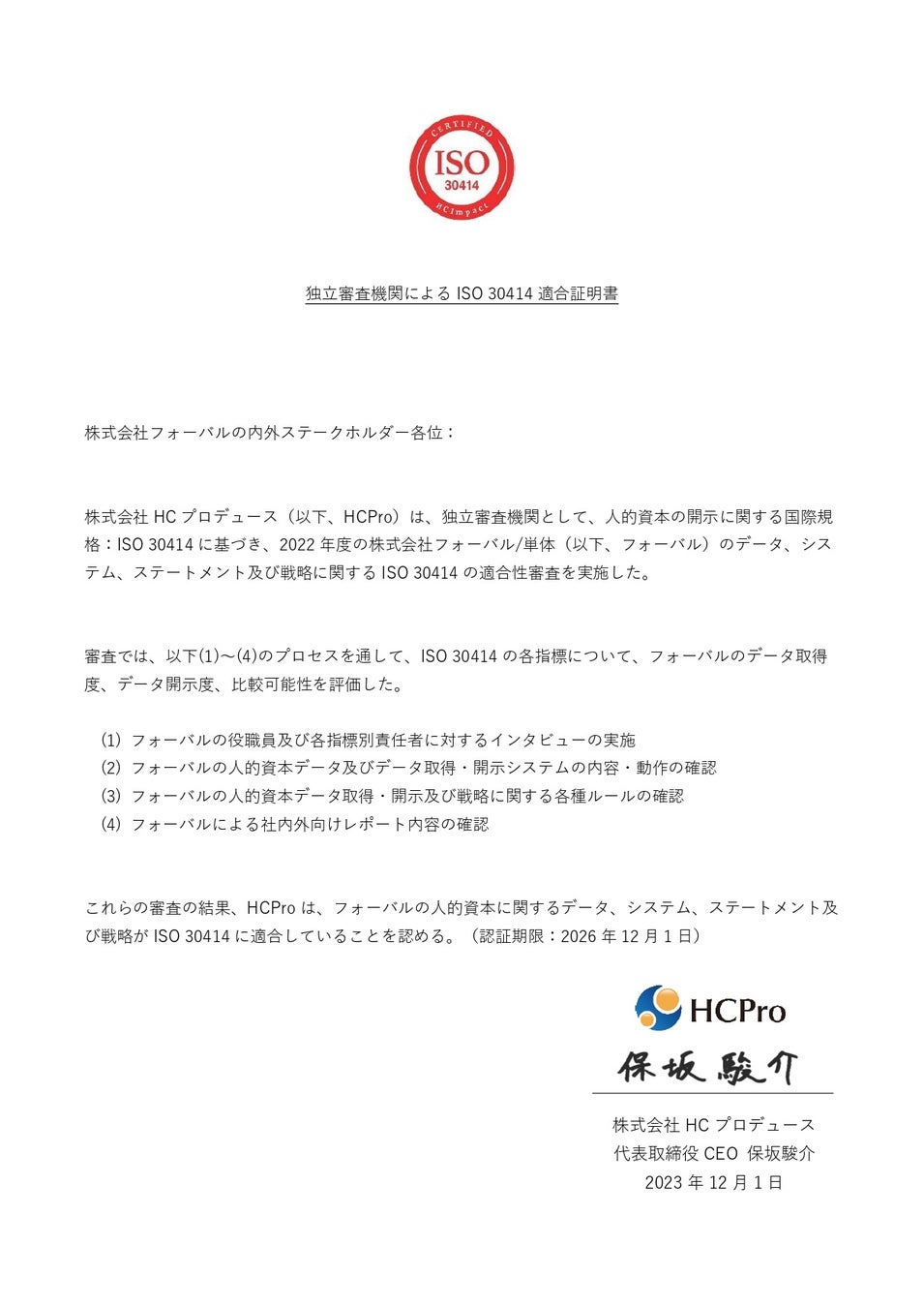 きと考え、今年2月にはフォーバルグループに所属する5名が「ISO 30414リードコンサルタント/アセッ