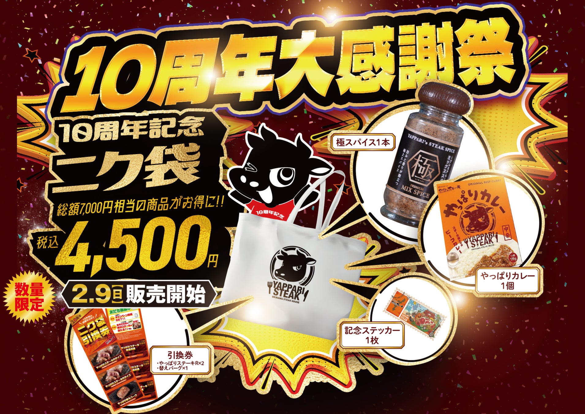やっぱりステーキ特製10周年記念ニク袋(福袋)の販売を行います。