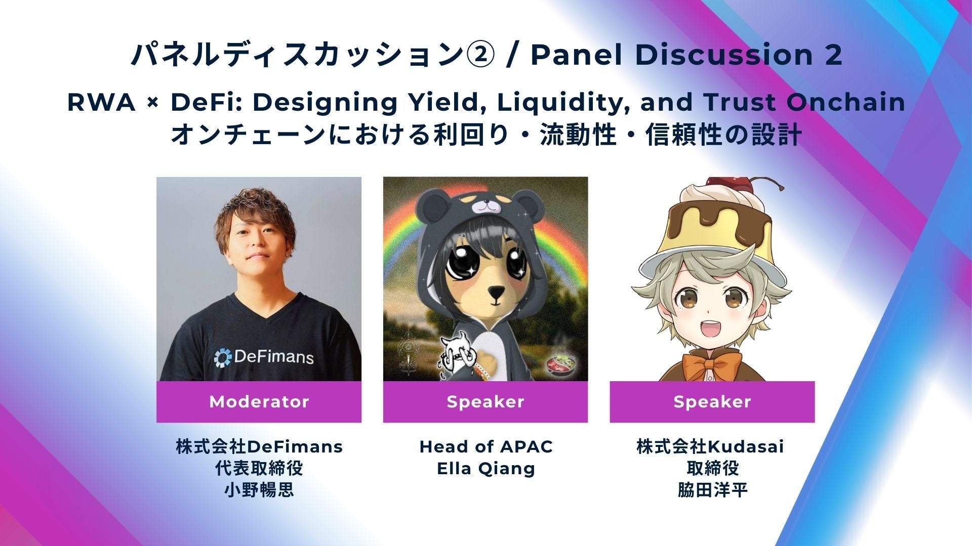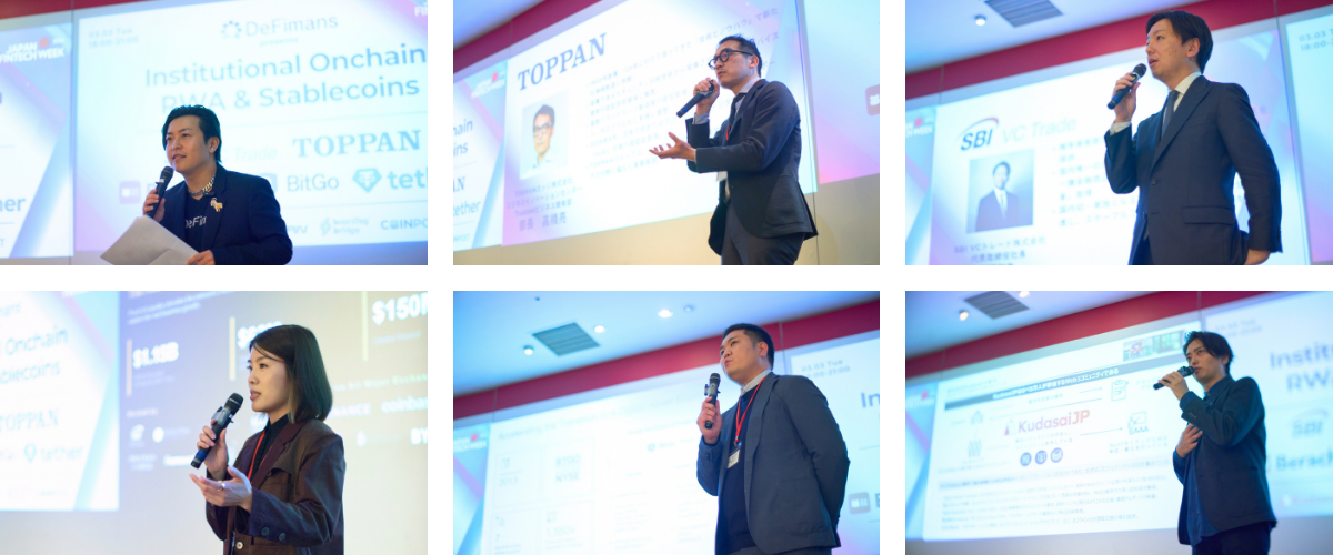 株式会社DeFimans(所在地:東京都港区、代表取締役:小野 暢思・佐藤 太思、以下「DeFimans」)は、Japan Fintech Week 2026期間中の公式連携イベントとして、日本市場での事業展開を本格化させる国内外プロジェクトと、国内企業の意思決定層・実務責任者が直接つながる場を提供することを目的とした「Institutional Onchain – RWA & Stablecoins」を2026年3月3日(火)に開催しました。