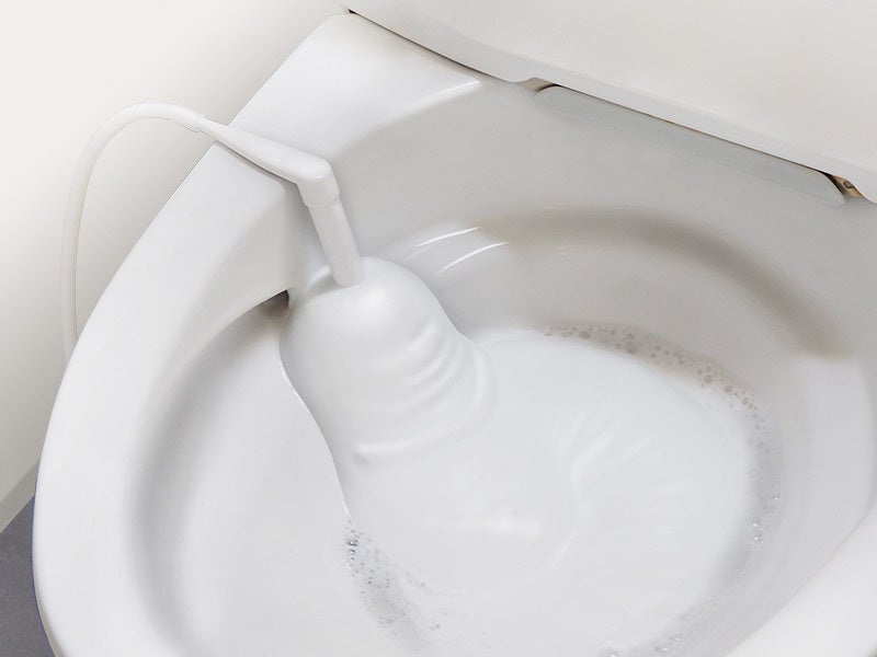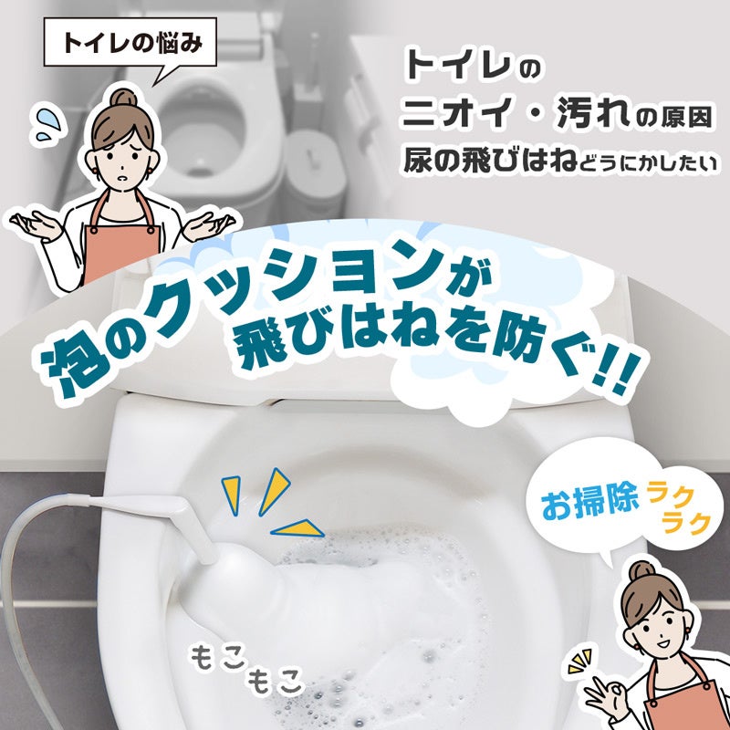 本製品はトイレの飛び跳ねや汚れを防止する後付け泡洗浄機です。